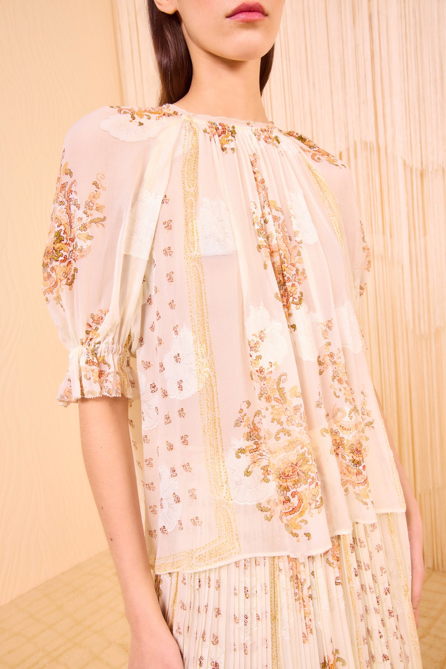 The Ulla Johnson Pippa Short Sleeve Blouse in Alabaster blends elegance with comfort. Made from lightweight chiffon jacquard, its delicate floral scarf print layered over tonal fil coupé botanicals adds subtle texture and charm. The blouse features a soft round neckline and puffed short sleeves with elastic cuffs that tie for a customizable fit. Unlined and breathable, it fastens with a buttoned back keyhole, perfect for effortless style on warm days.