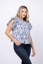 Elevate your wardrobe with the Ulla Johnson Sienna Flutter Sleeve Top in Ciel. Featuring delicate blue and white hues and graceful flutter sleeves, this blouse offers a perfect blend of elegance and comfort. Its airy design makes it ideal for both casual outings and refined occasions, ensuring you look effortlessly chic wherever you go.