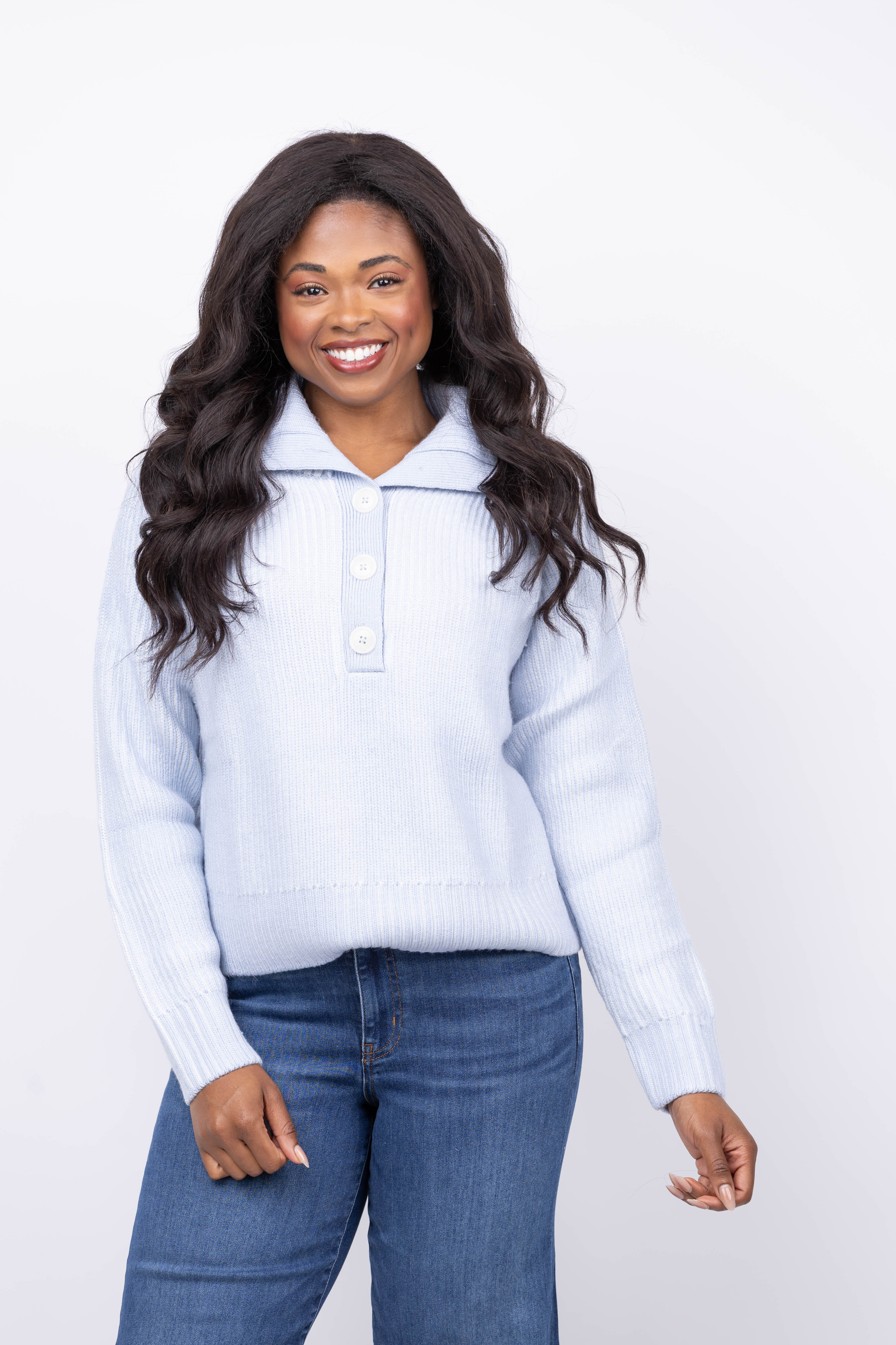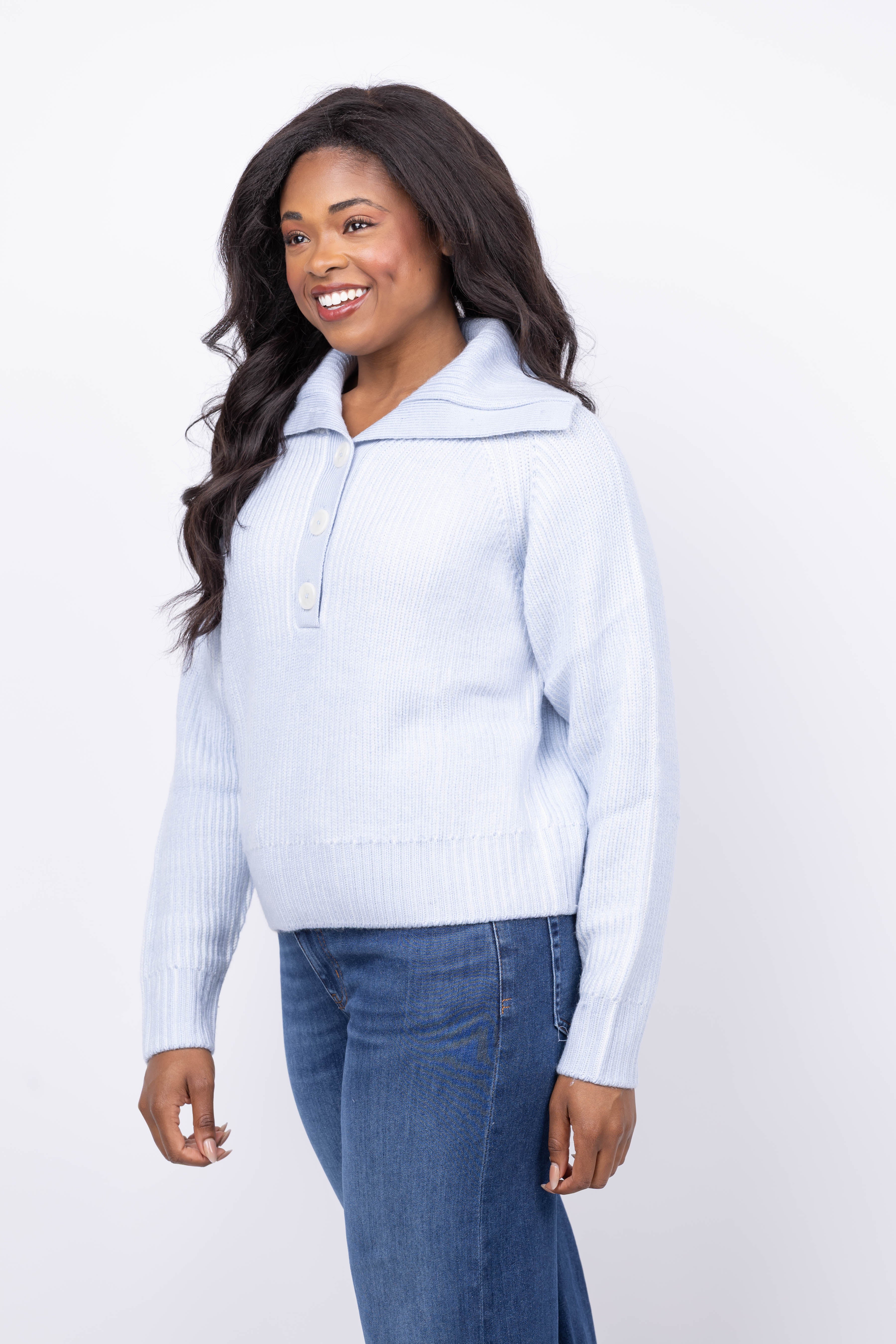 Elevate your everyday style with the Varley Filey Plated Sweater in Mist Blue. Made from a luxurious Alpaca blend yarn, its elegant texture and subtle tonal plating bring refined warmth to a minimalist design. Thoughtfully crafted with raglan sleeves, a half-button placket, and a turn-back collar, this sweater offers relaxed comfort while maintaining a chic silhouette. Pair it with the matching Dionne beanie and Deville scarf for a polished, coordinated look that effortlessly blends sophistication and ease.