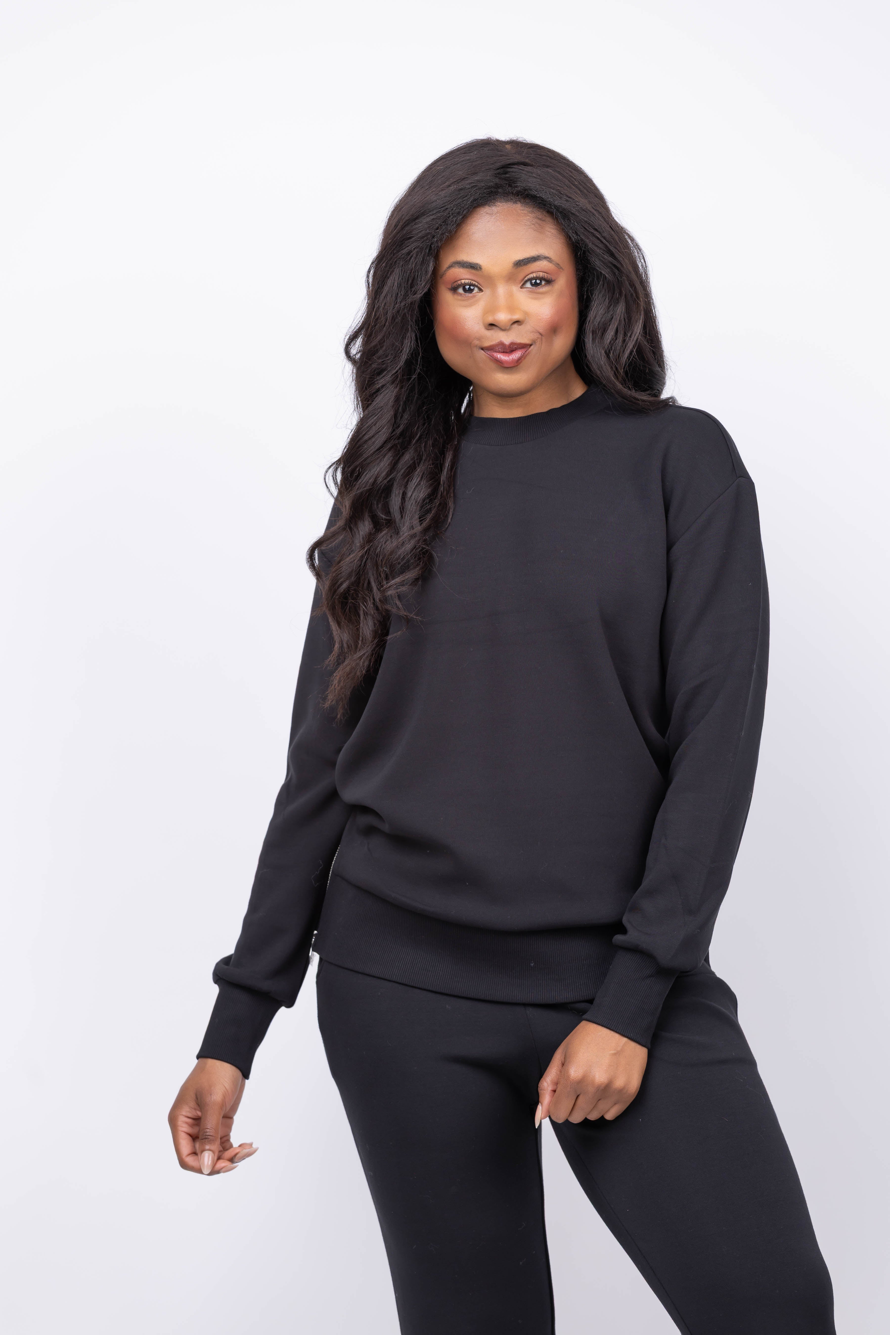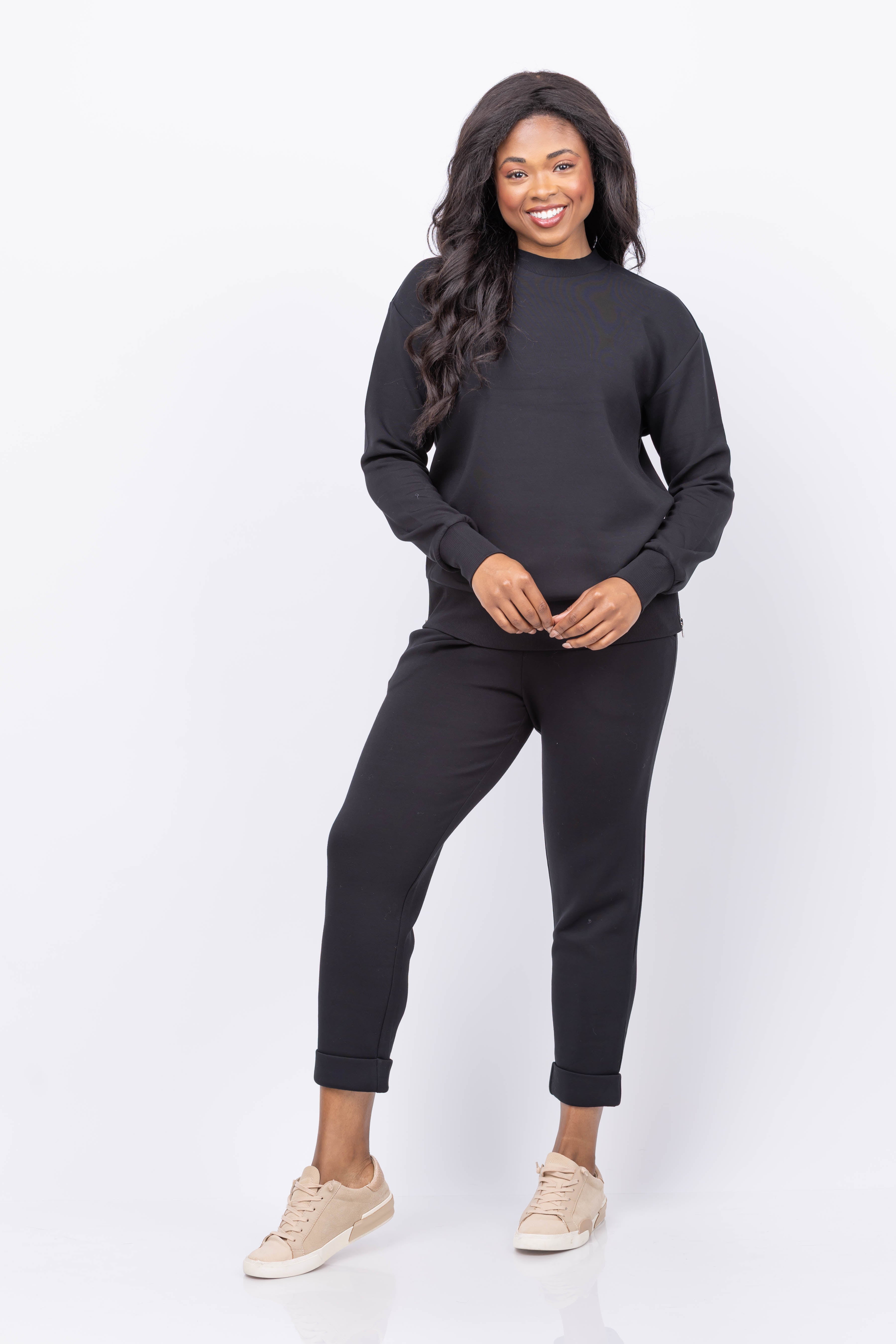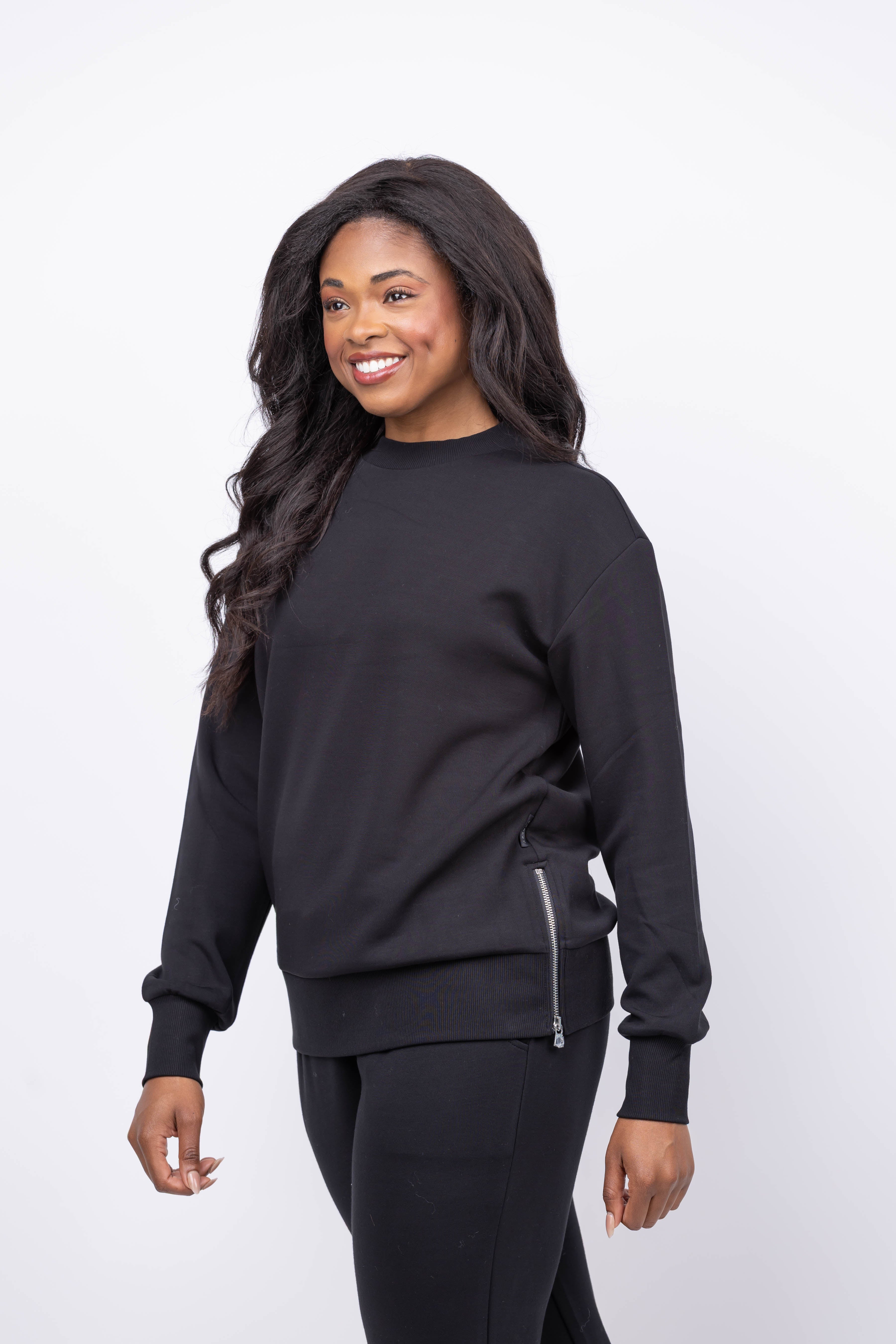 The Varley Gabriella Sweatshirt in Black combines relaxed comfort with practical style. Its mid-length cut and classic crew neck offer a timeless look, while side zips provide adjustable ventilation. Crafted from lightweight DoubleSoft® fabric, this sweatshirt feels incredibly soft against the skin and is ideal for layering to keep you warm without bulk. Ribbed trims help trap heat, making it a versatile choice for cooler days.