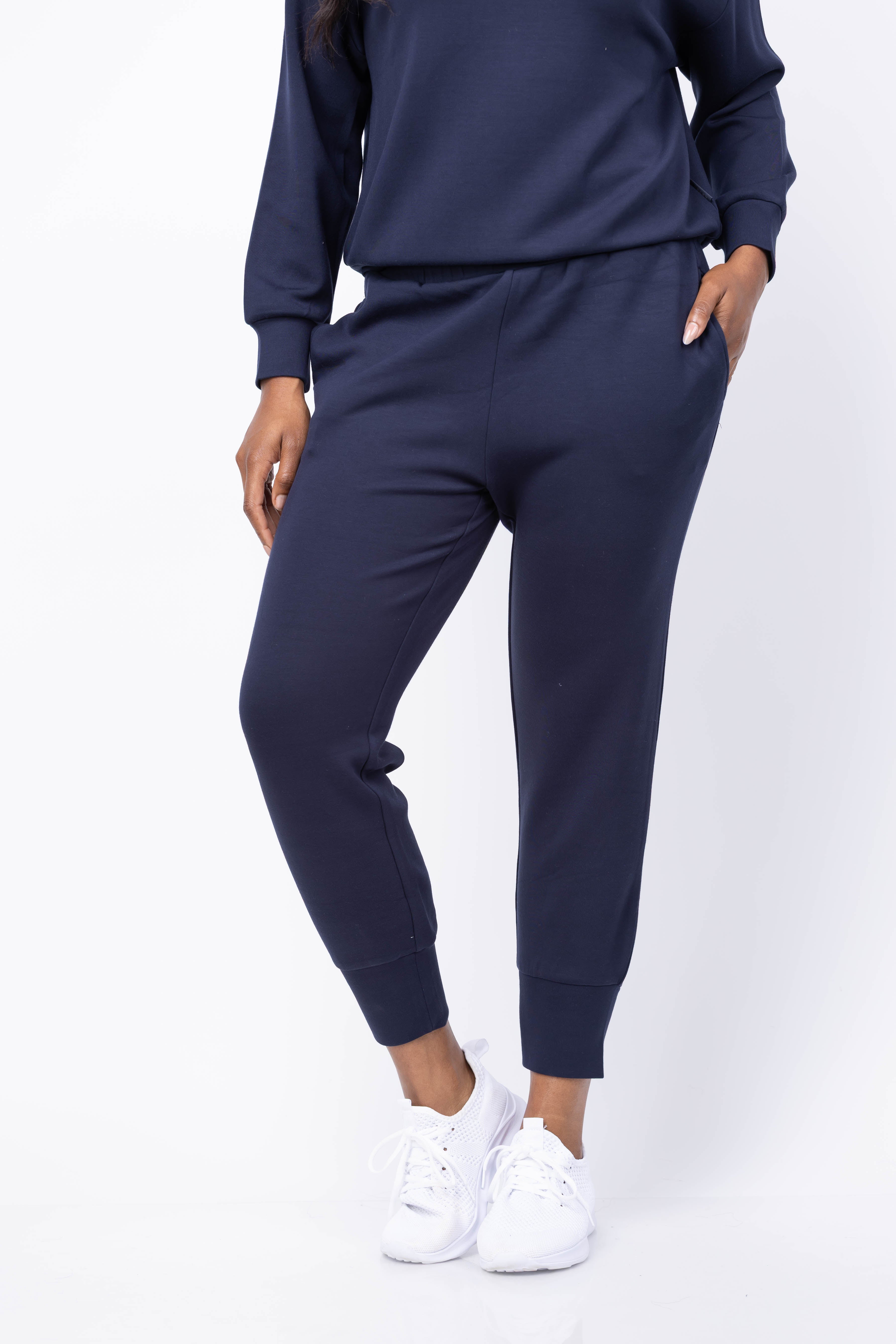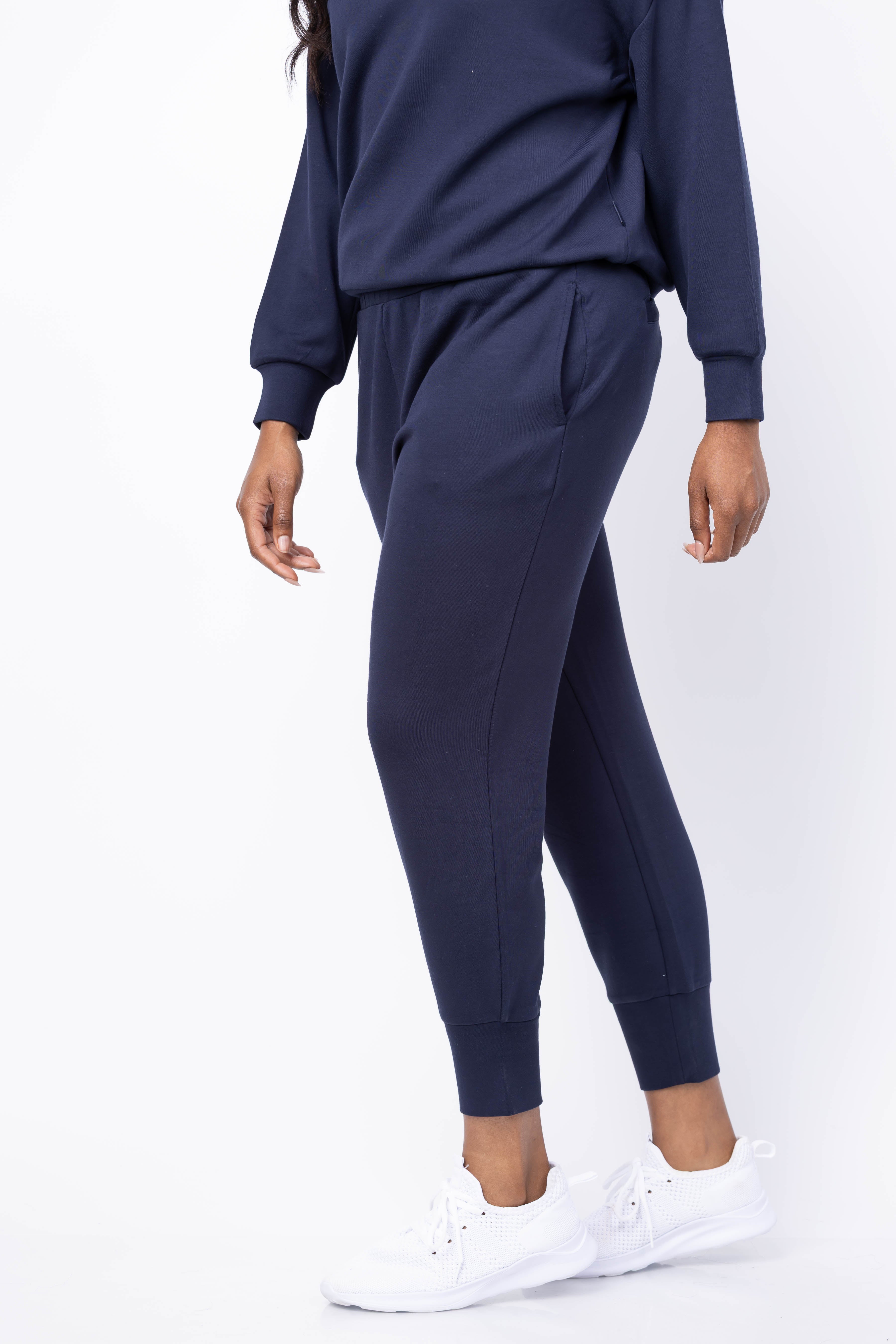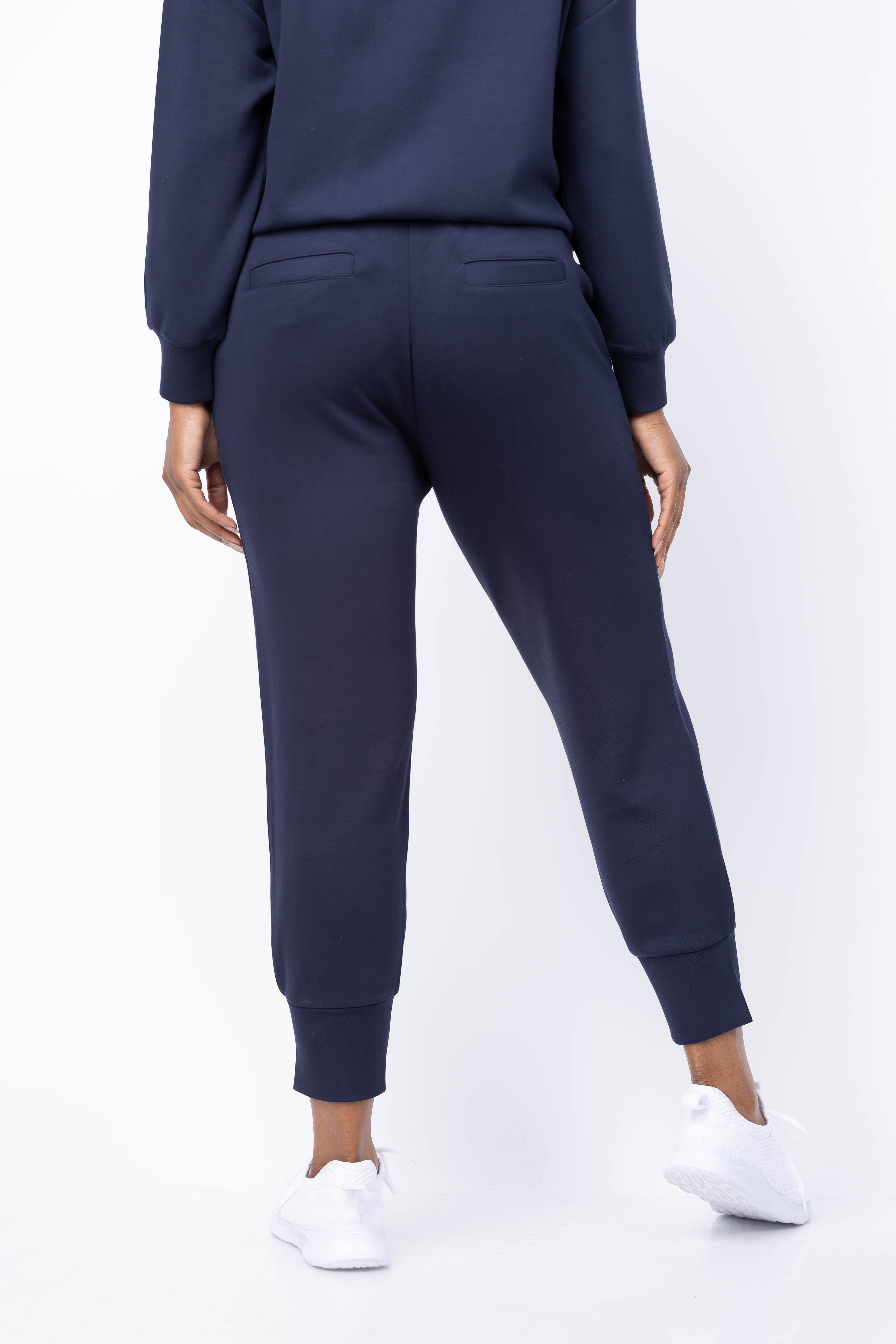 Embrace refined style with Varley's The Slim Cuff Pant in Navy. This tailored essential features a flattering slim fit that skims your silhouette beautifully, while the sophisticated cuffed hem adds dimension and polish. An elasticated waistband paired with an internal drawcord lets you customize your fit for all-day comfort and confidence. Functional side and back pockets keep your essentials within reach. Layer with our DoubleSoft® sweaters for an impeccably coordinated look that balances comfort with understated elegance.