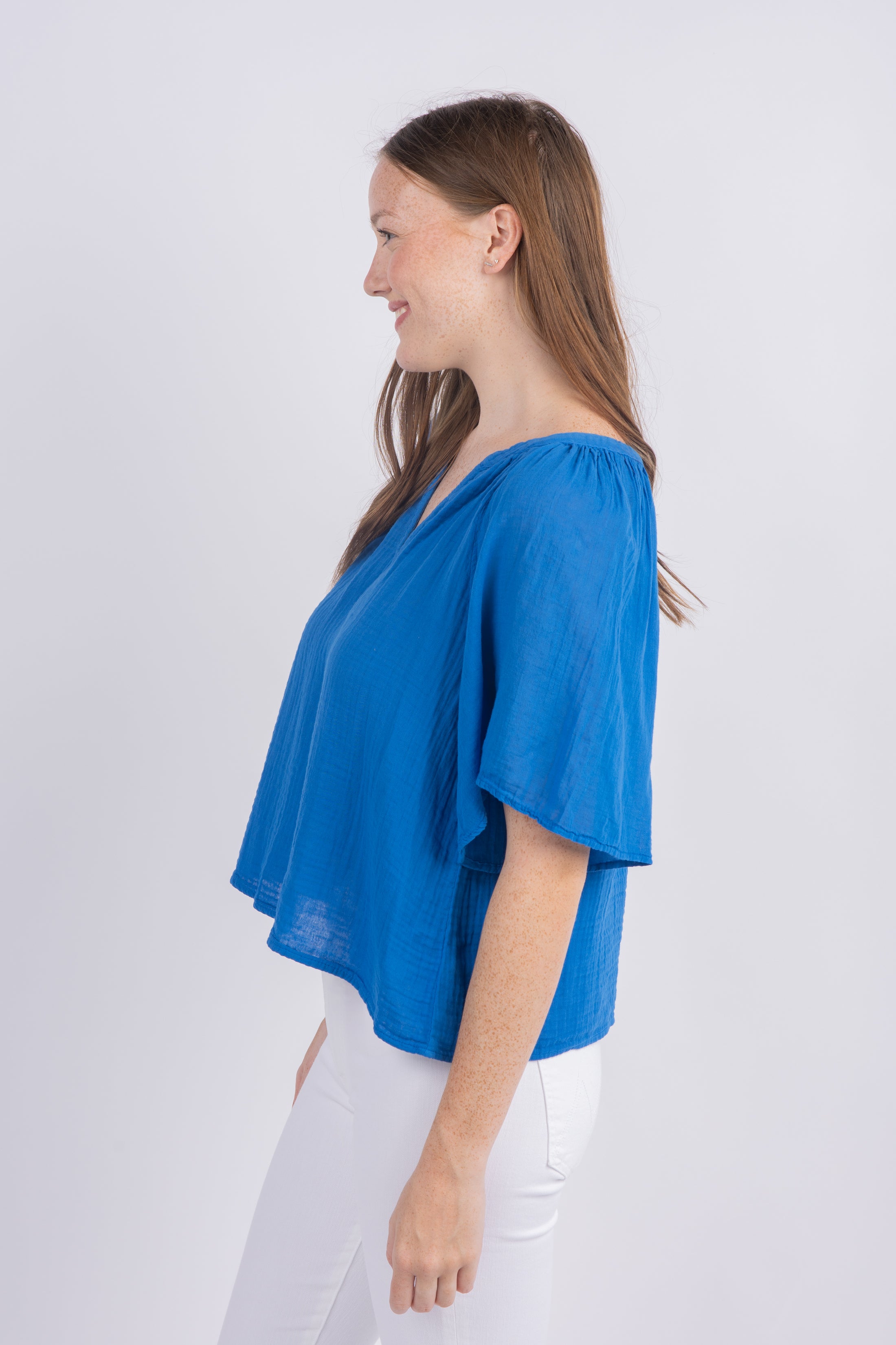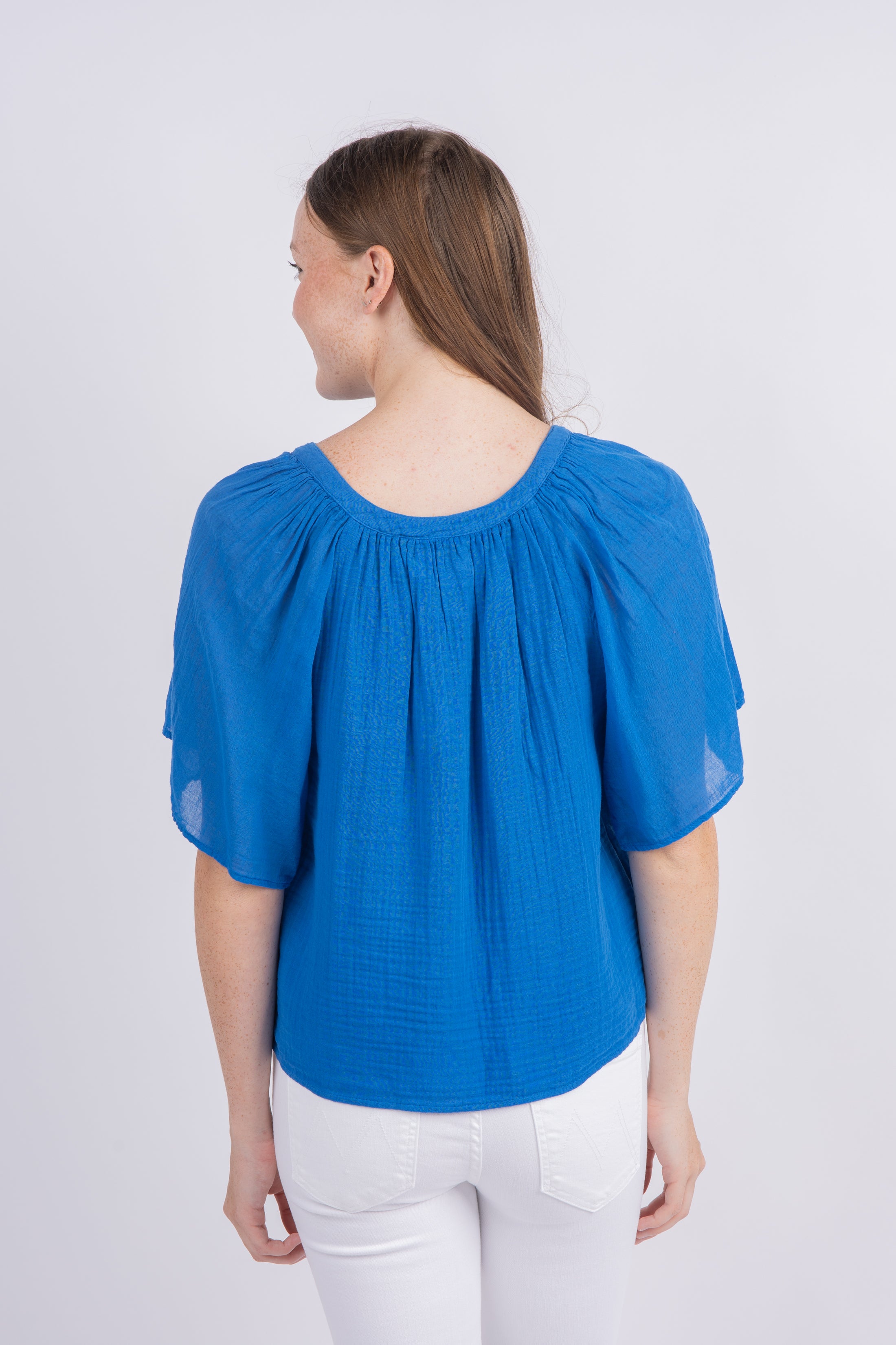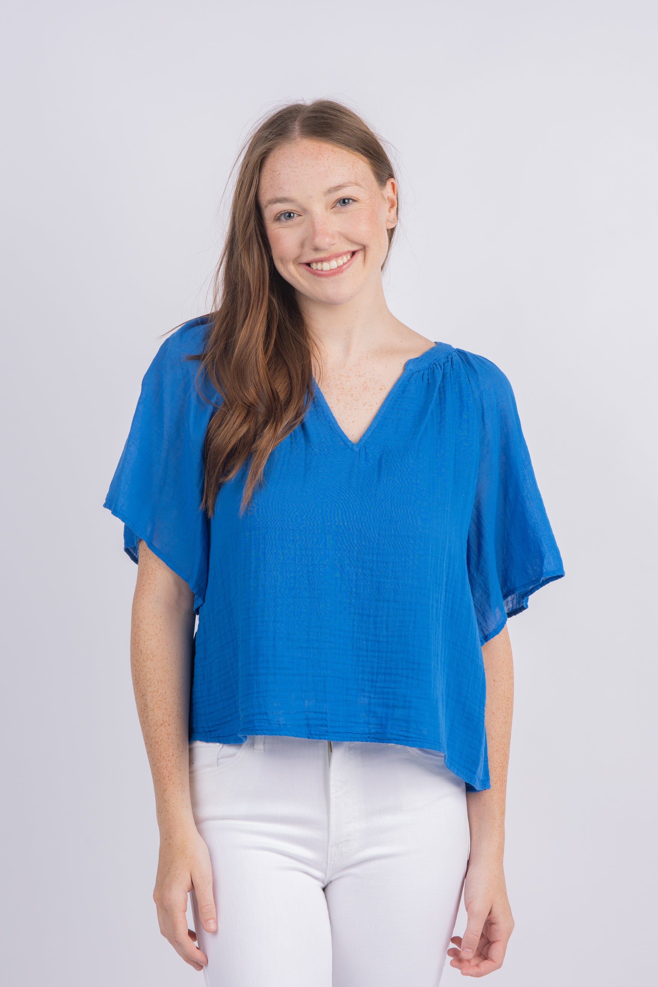 Look and feel amazing in the Velvet Belle Top. This beautiful top is crafted from 100% cotton and features stunning flutter sleeves. The breathable gauze fabric and made in the USA craftsmanship make this top an ideal choice for warm weather style. Machine wash for easy upkeep.