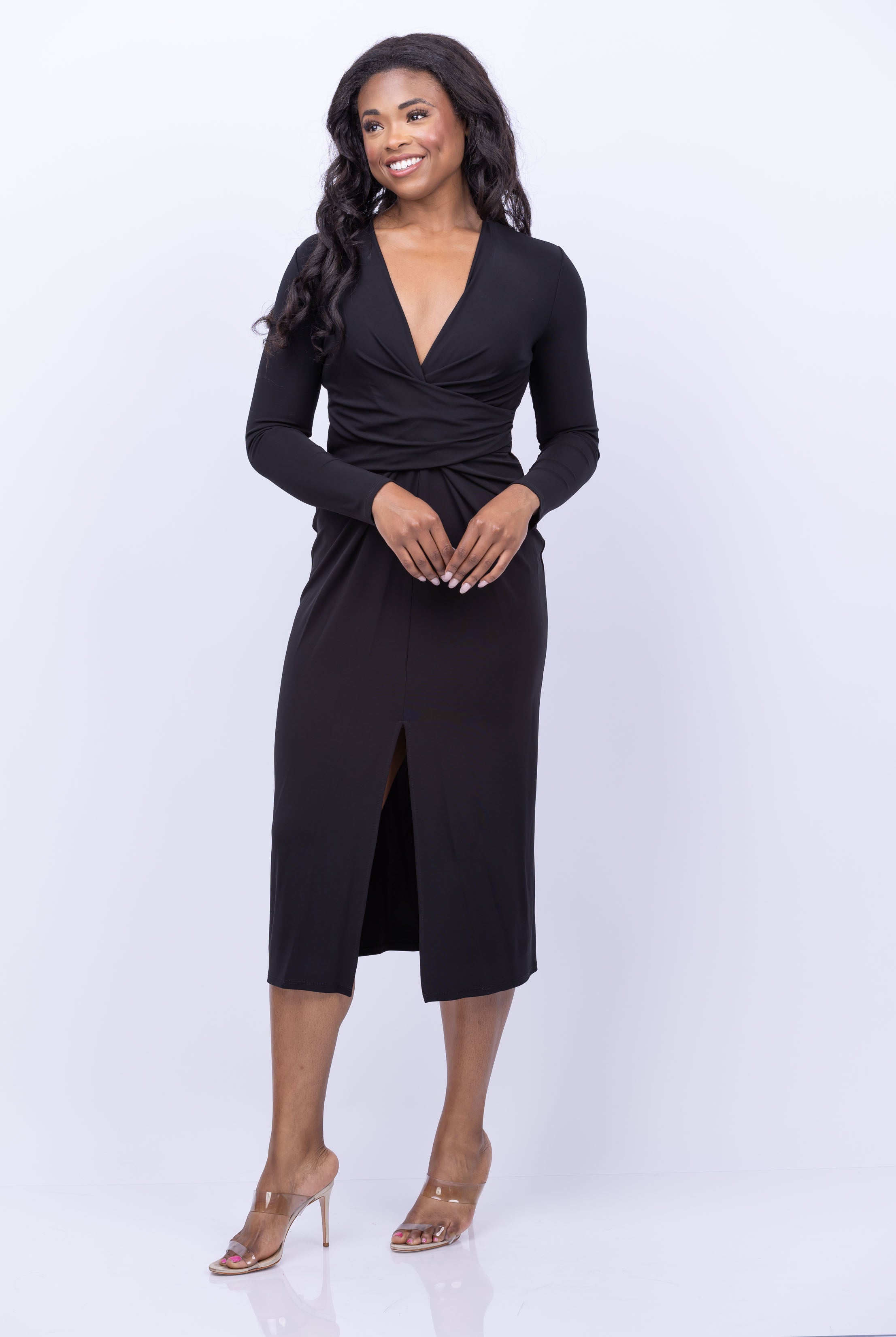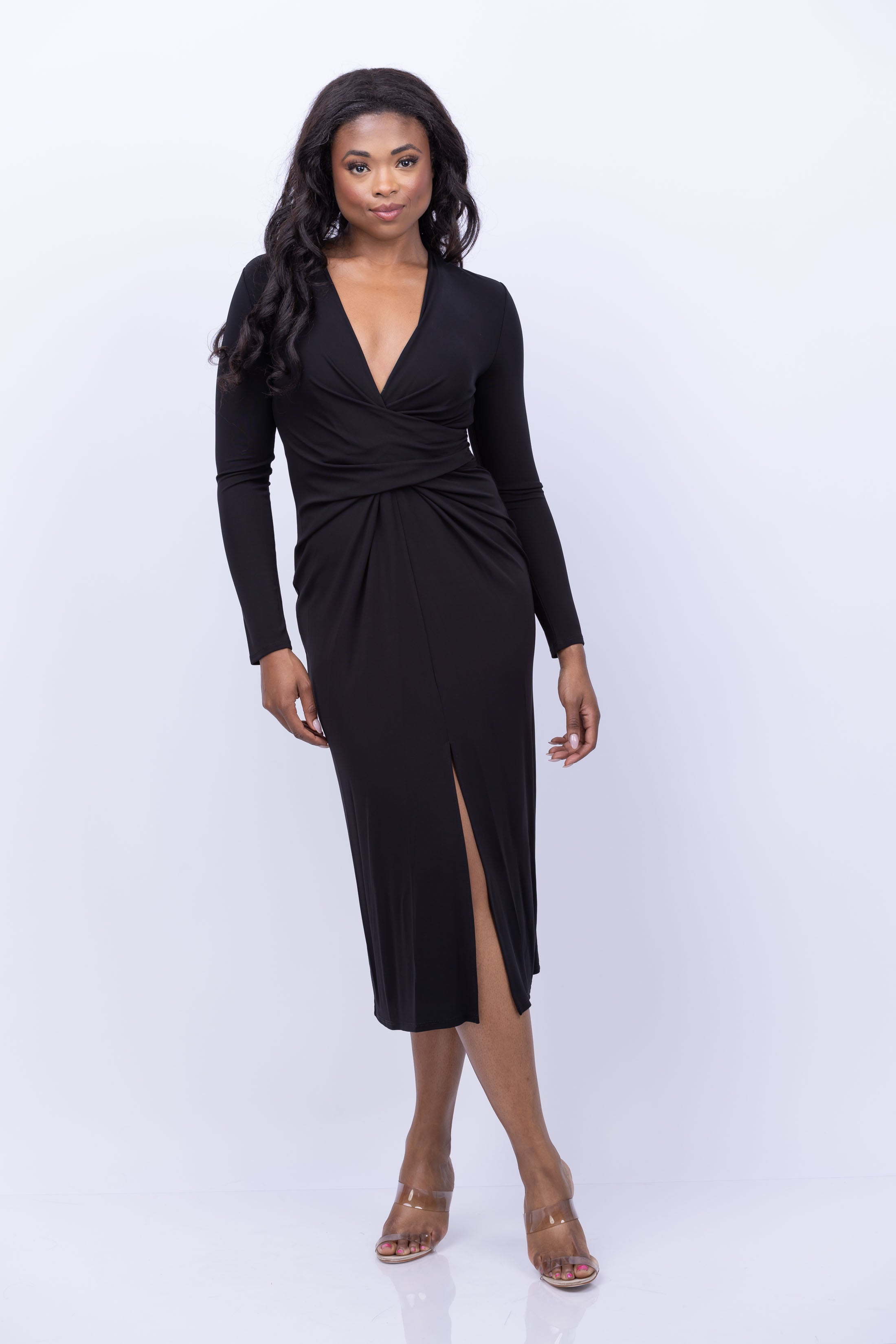 Look your best in this classic black Velvet Eliana Dress! Featuring a V-neck, long sleeves, and wrap effect at the waistline, it creates a feminine, flattering silhouette. A slit in the front provides ease of movement. Don't miss out on this stylish piece that will take your look to the next level.