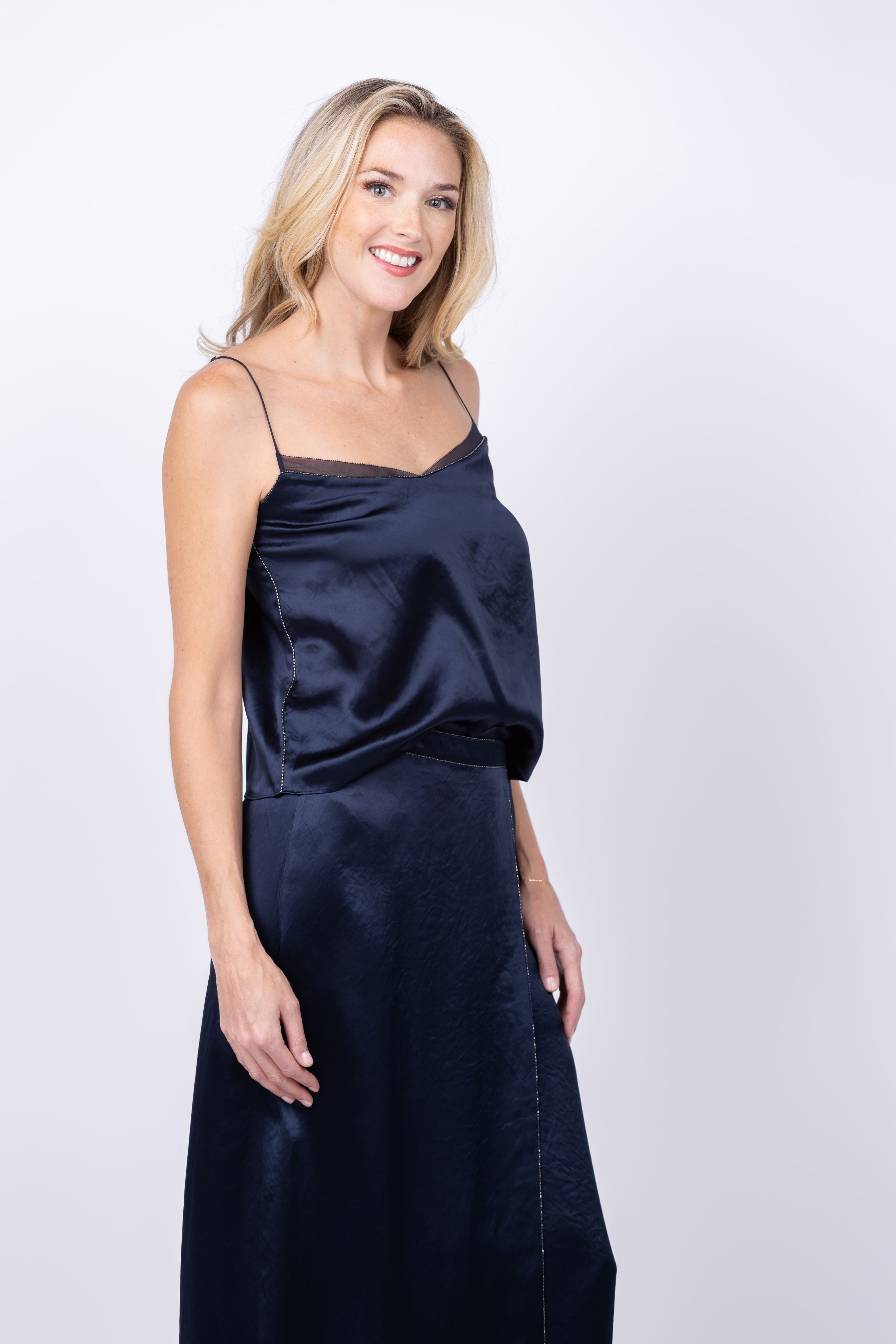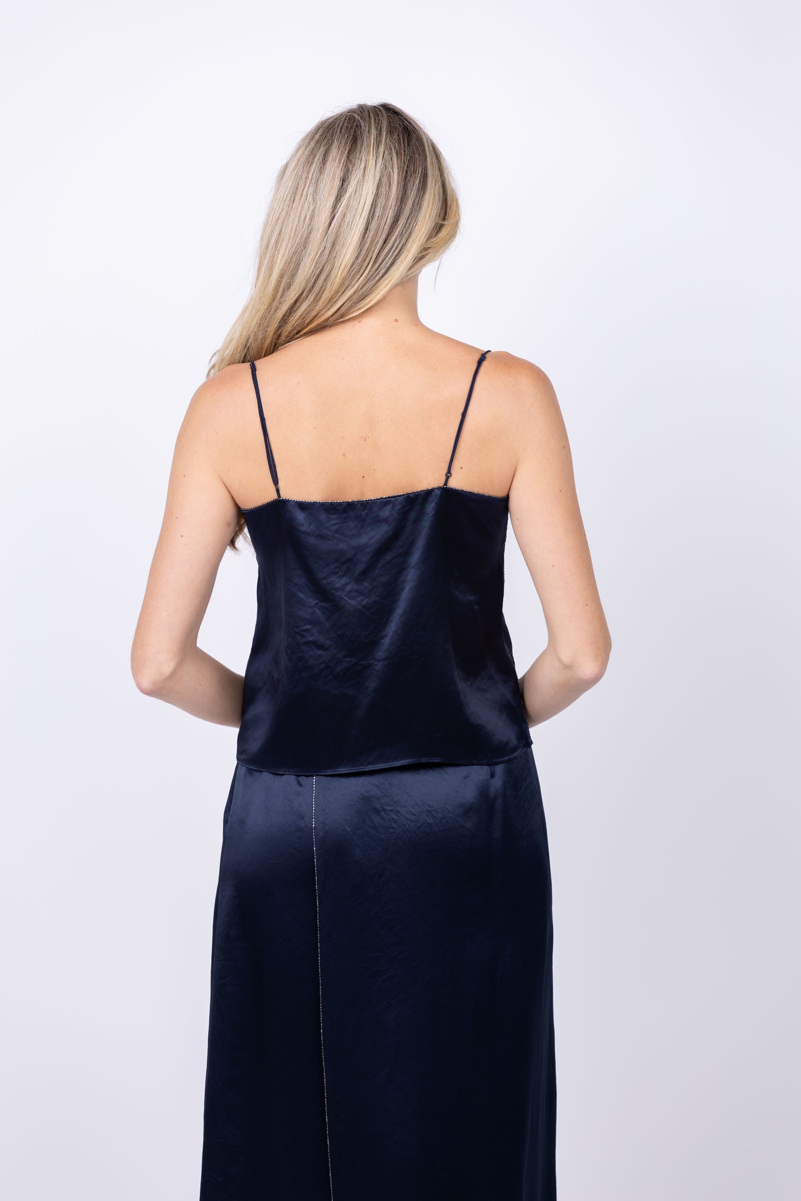 Elevate your style with the Vince Beaded Boarder Cami in Coastal. Made of sheer silk chiffon, it features delicate metal beads adding a subtle touch of shine. Perfect for dressier occasions, pair it with the Beaded-Border Satin Slit Skirt for a complete look. Embrace luxury and sophistication in this stunning camisole.