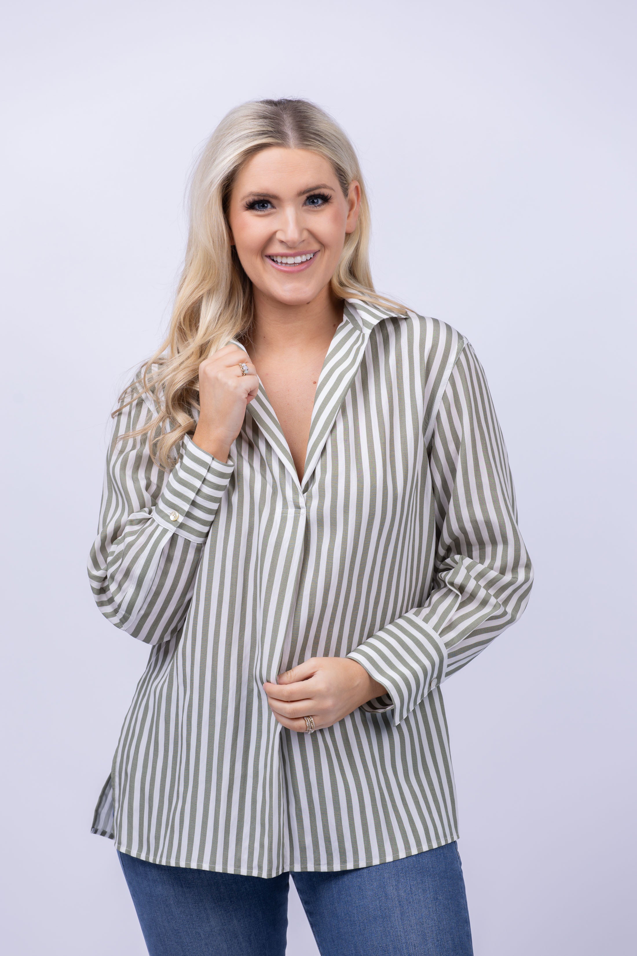 Elevate your style with the Vince Coastal Stripe Shaped-Collar Shirt. Effortlessly polished, this shirt features a split neck and center pleat for a sophisticated touch. The coastal stripes in sea fern and optic white add a fresh coastal vibe to your wardrobe.
