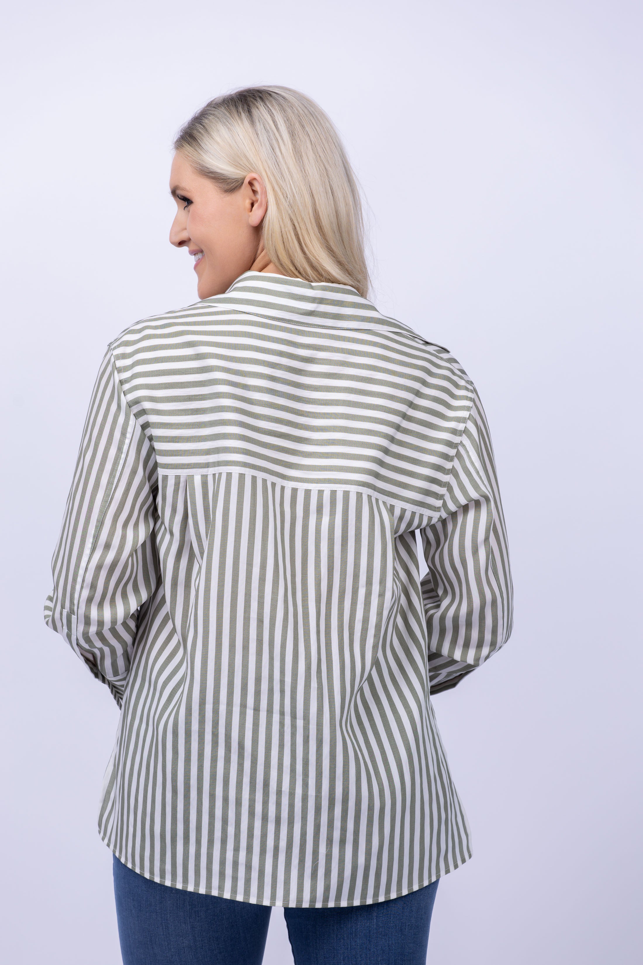 Vince Coastal Stripe Shaped-Collar Shirt in Sea Fern/ Optic White