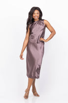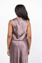 Elevate your wardrobe with the Vince Embroidered Shell in Smoky Berry. This elegant satin top features delicate floral embroidery on the shoulder and hem, adding a touch of artistry and charm. Paired with the matching slip skirt, it creates a beautiful, mood-lifting ensemble perfect for any occasion. Experience the effortless joy and refined style this signature piece brings to your collection.