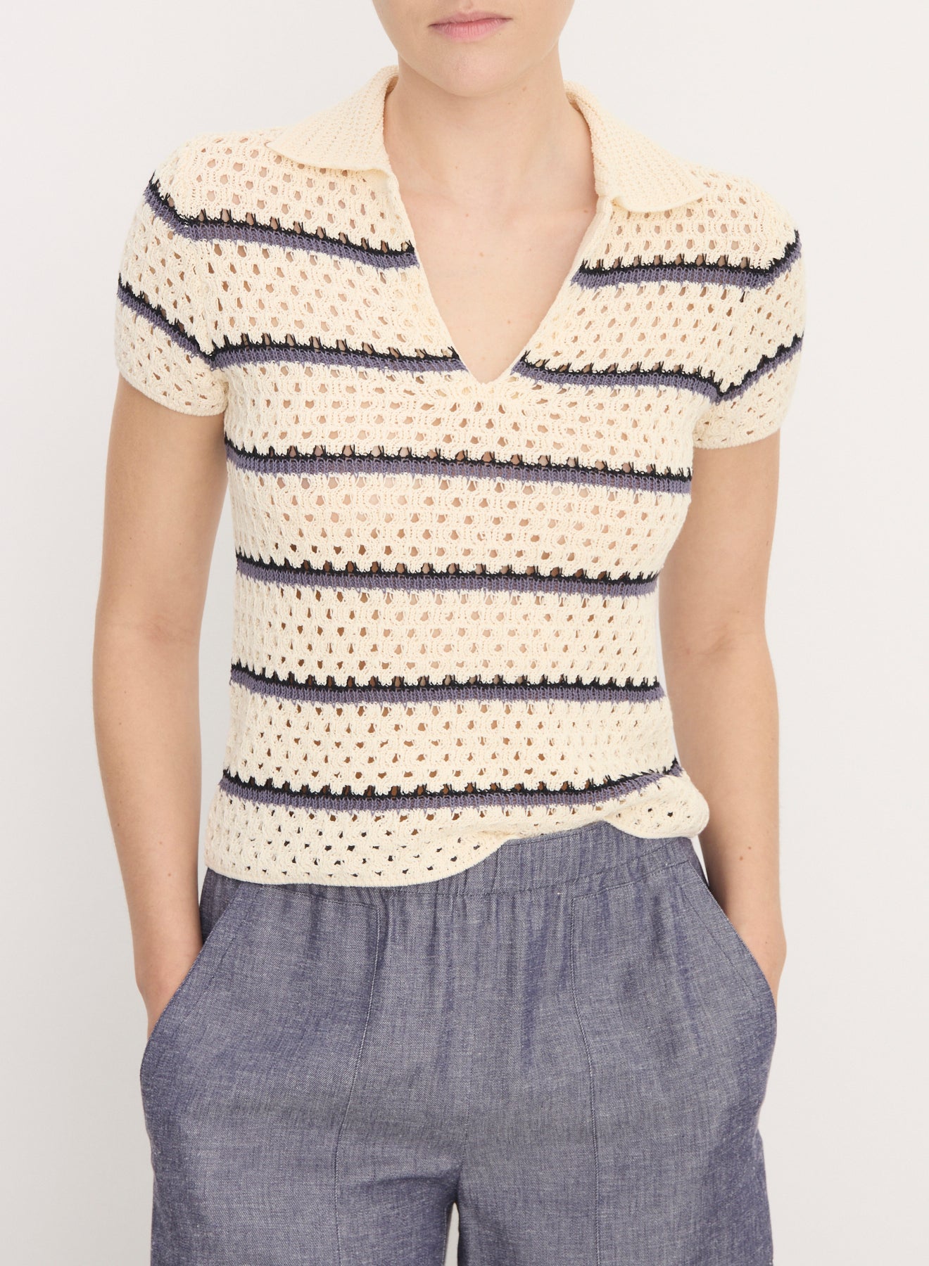 Experience the perfect blend of style and comfort with the Vince Macrame Stripe Henley in Off White Combo. Crafted from Italian cotton using an open macramé stitch, this polo sweater offers a unique textured look while keeping you cool and breathable on warmer days. Its lightweight design makes it an ideal choice for effortless layering or standalone wear, ensuring you stay comfortable and stylish as the seasons change. Elevate your wardrobe with this versatile piece that combines craftsmanship and contemporary flair.