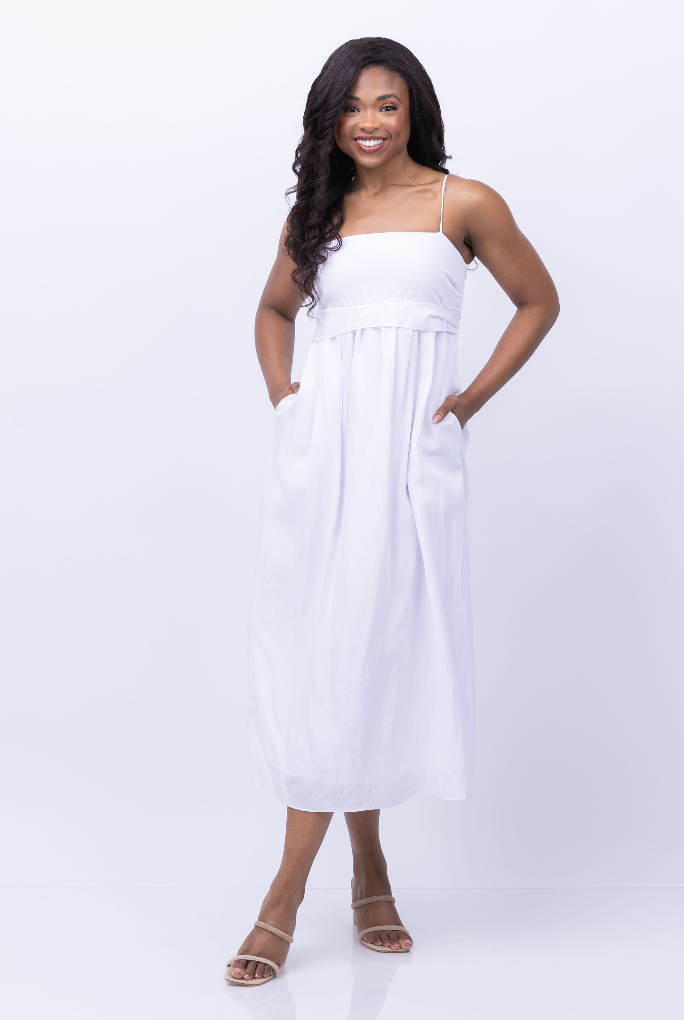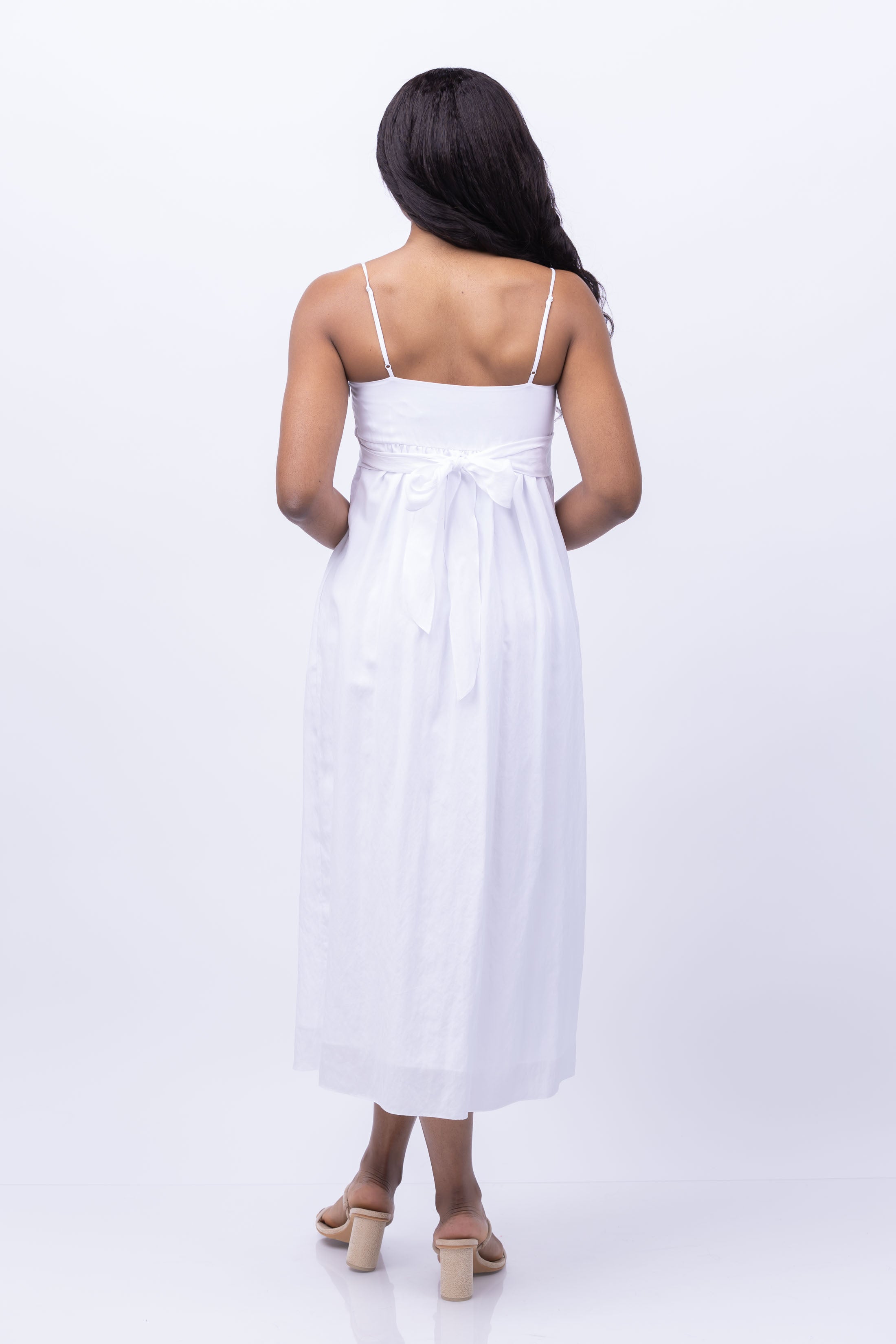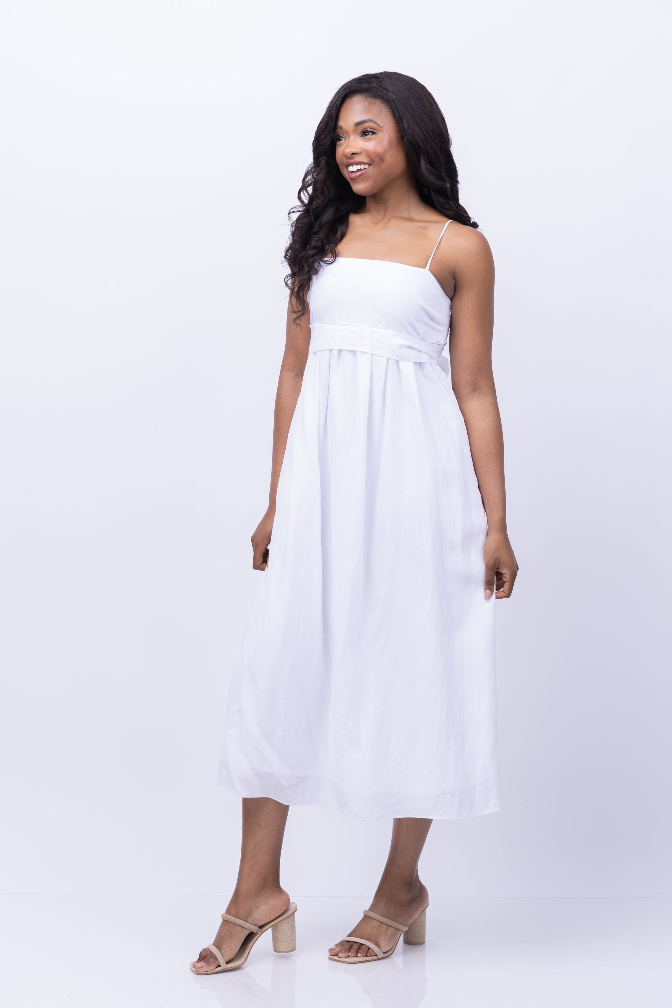 Introducing Vince's Ruched Panelled Tie-Back Midi Dress - the ultimate combination of style and comfort! The adjustable straps and empire waist provide a perfect fit, while the A-line silhouette and scoop neckline elevate your look. With long tie-back straps and a hem that falls below the knee, this dress is bound to make a statement.