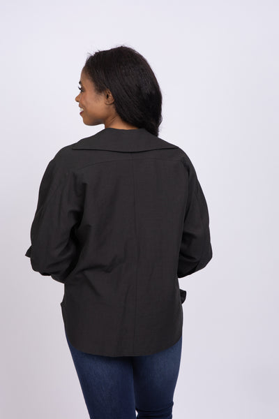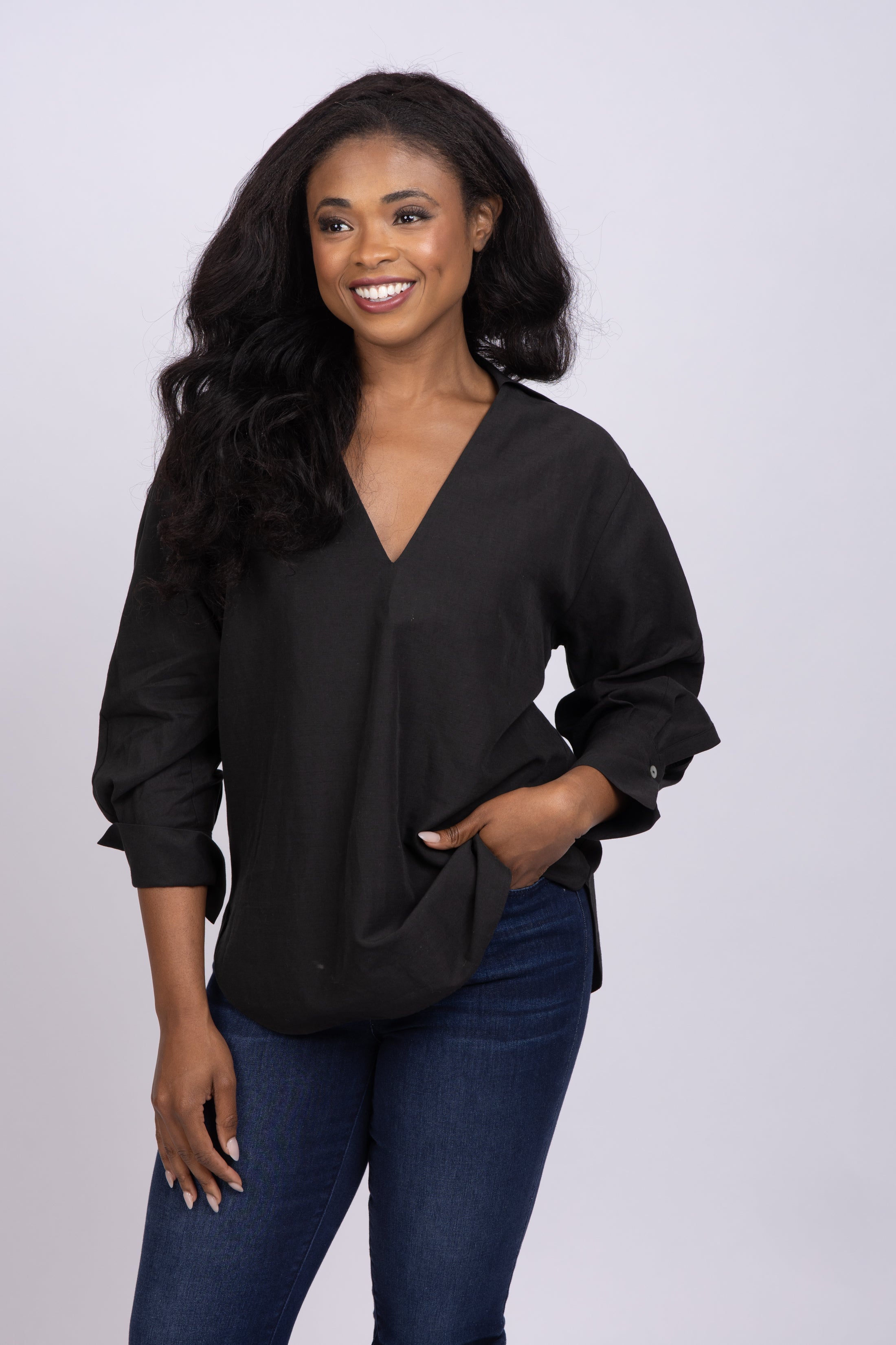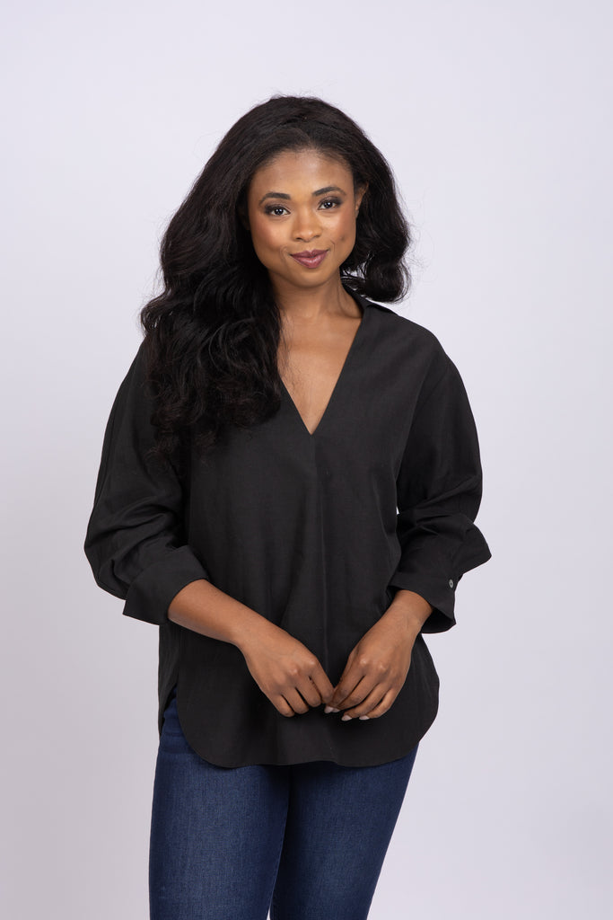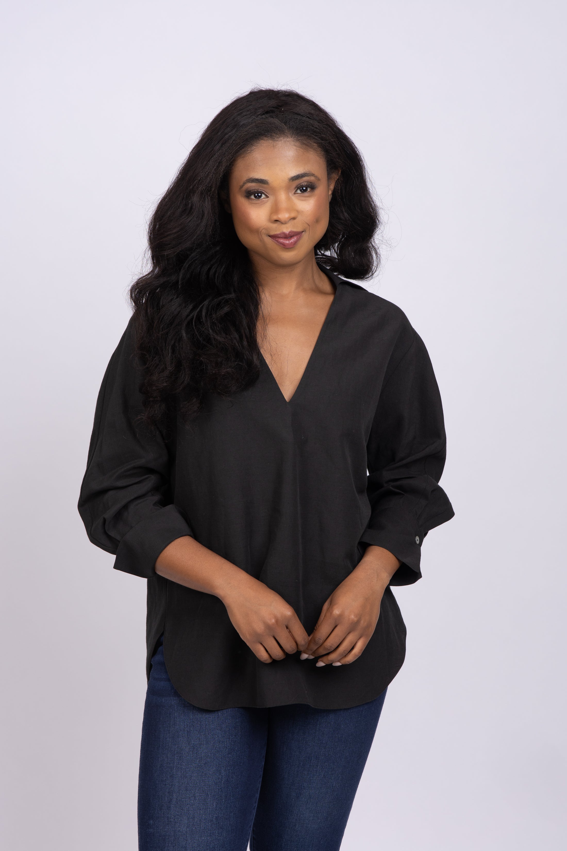Flatter your figure in our Vince Shaped Collar V-Neck Shirt in Black! Crafted with sumptuous cotton-blend for an effortless look, this timeless top features a chic V-neck, dolman sleeves, and an extended length for an undeniably flattering silhouette. Ready to take your look to the next level?