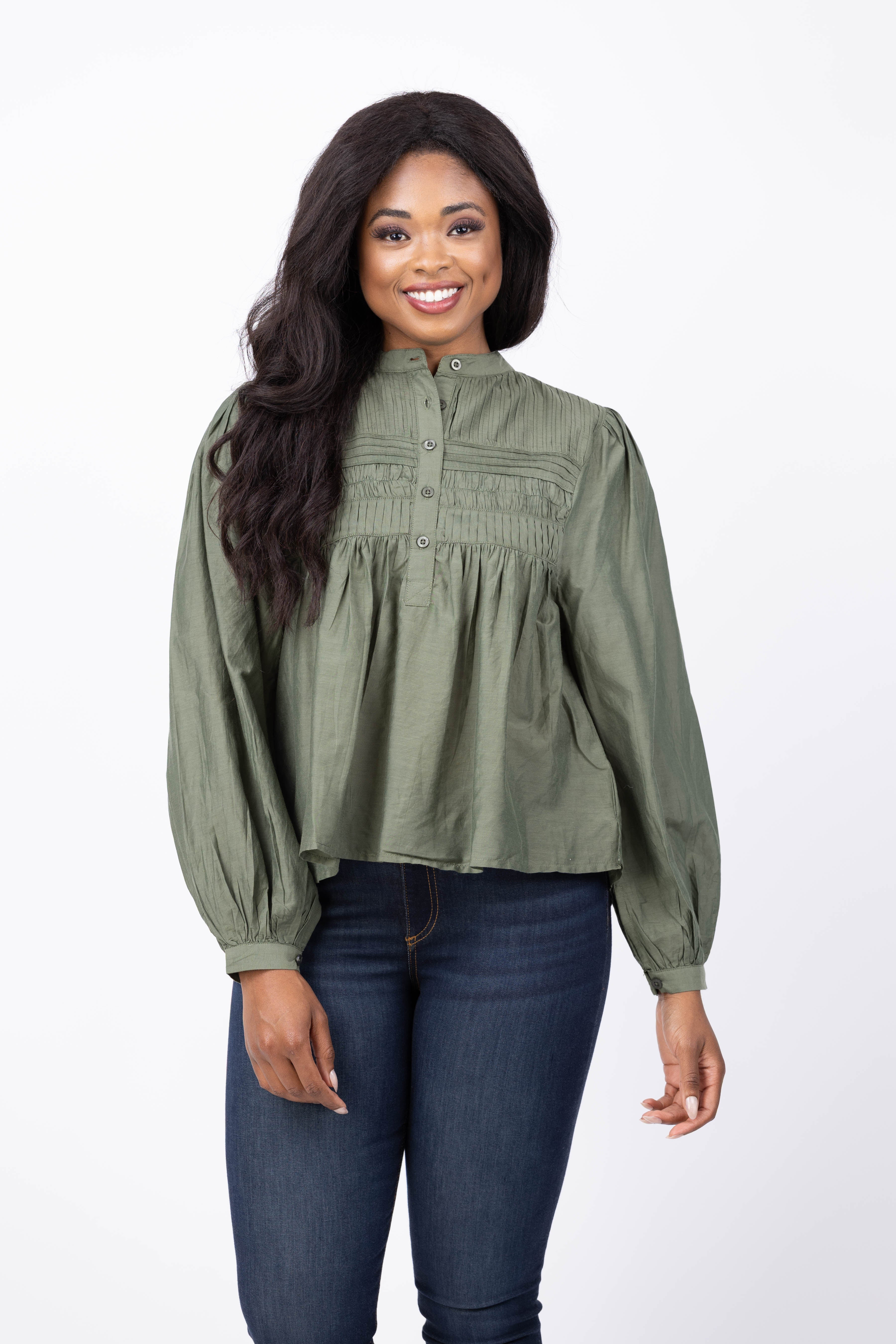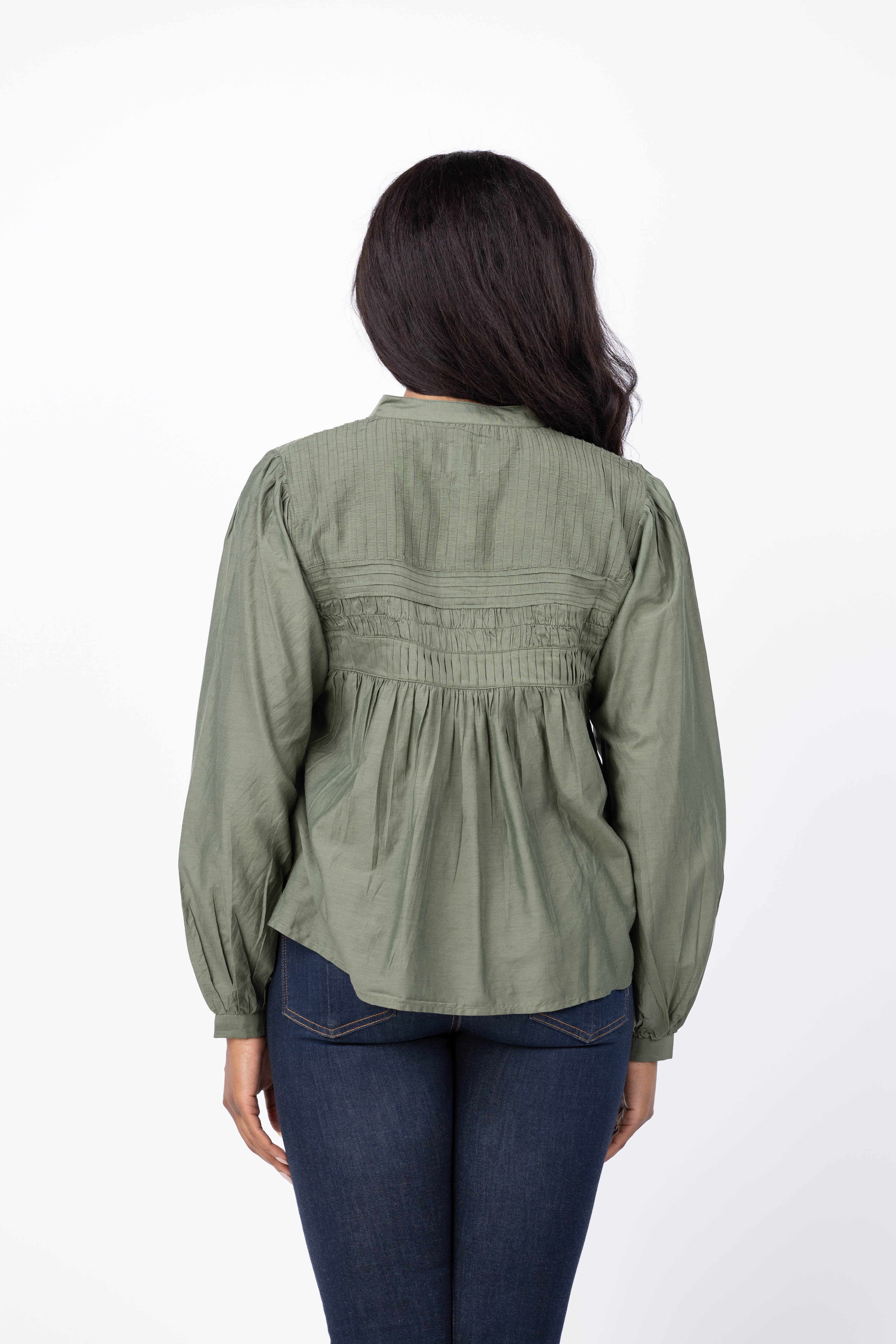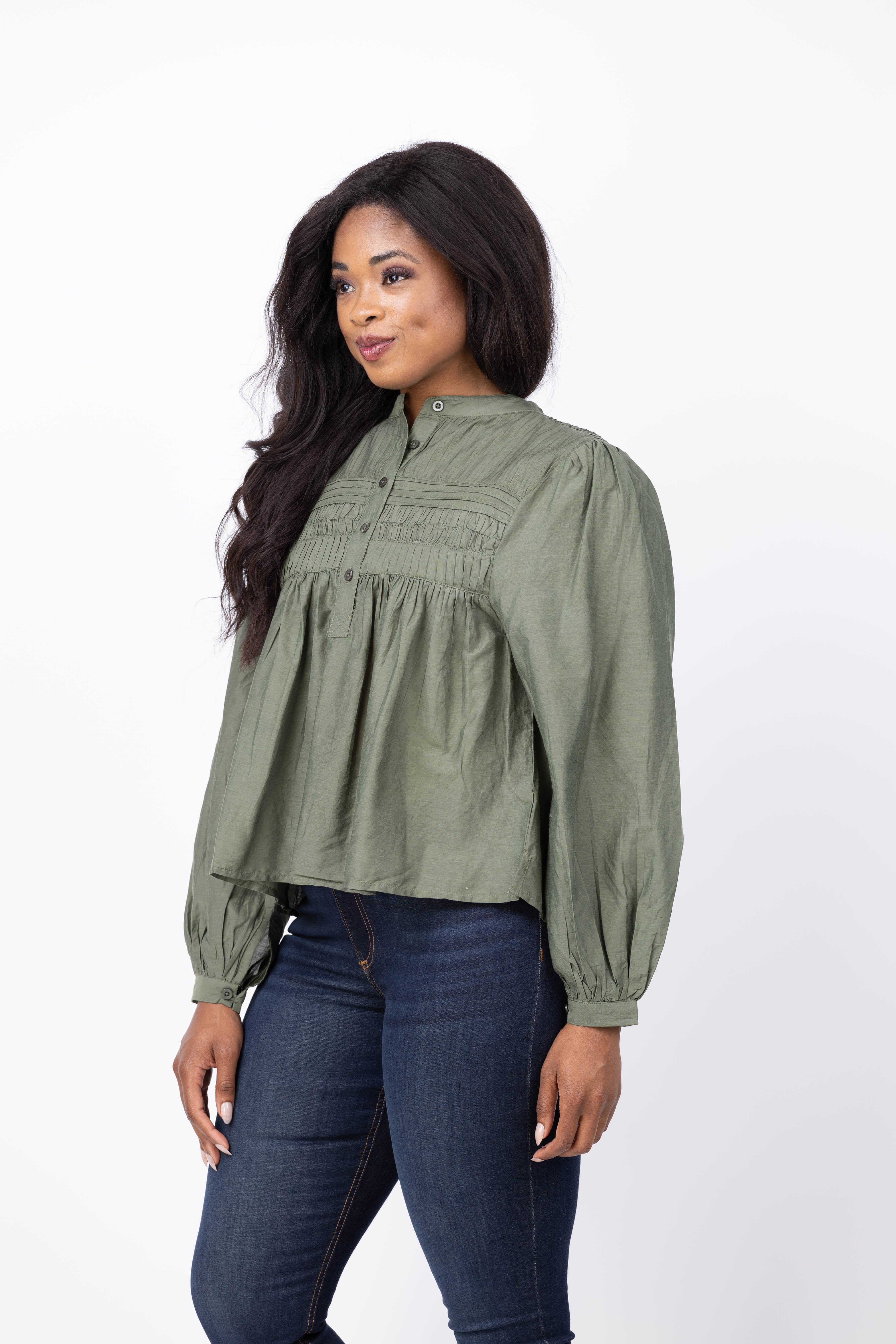 The We Are Sundays Arya Blouse in Cyprus combines a luxurious cotton-silk blend with a relaxed, oversized fit for effortless elegance. Its delicate pintucking and split-neck design add subtle sophistication, while billowy sleeves with structured button cuffs create a graceful silhouette. Falling at the high hip, it pairs perfectly with mid-rise jeans for a chic French tuck. Lightweight and airy, this blouse elevates your everyday wardrobe with comfort and style.