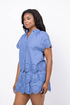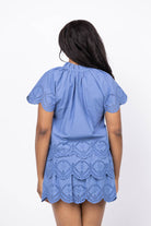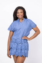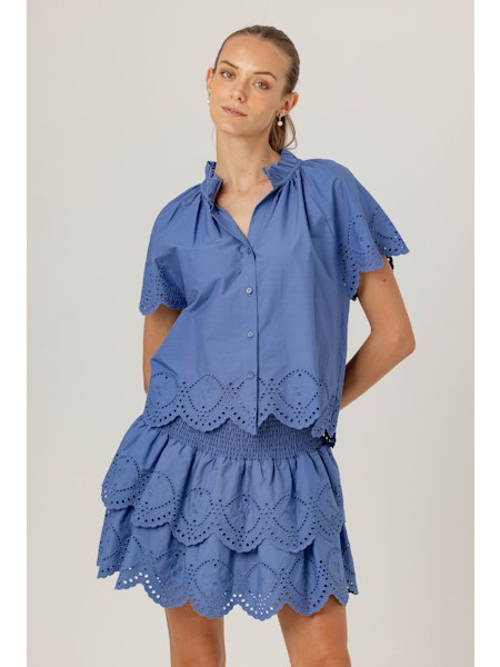 The We Are Sundays Corinne Shirt in Riviera combines delicate ruffle accents and intricate embroidery for a feminine, elegant look. Its relaxed fit and flattering length make it perfect for pairing with high-rise jeans or the Felice Skirt. This versatile shirt adds effortless charm to your warm-weather wardrobe, ensuring you stay stylish and comfortable all season long.