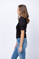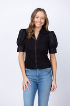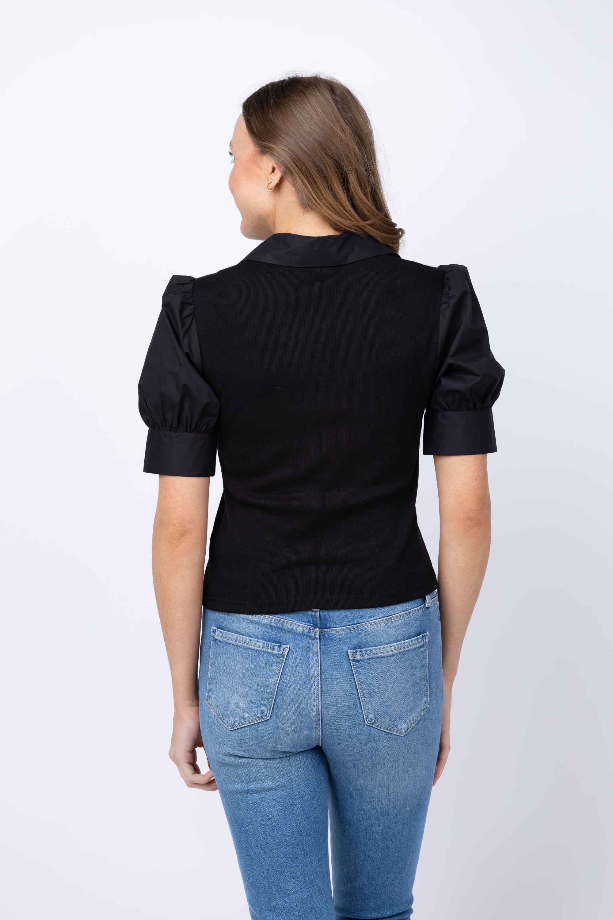 The Hale Shirt combines sophisticated design with everyday wearability. Its mixed-media construction pairs a stretchy ribbed knit body with crisp cotton poplin accents—sleeves, collar, and placket—for a polished look that moves with you. The slim-fitting silhouette hugs your curves beautifully while the subtle V-neckline and classic collar add refined elegance. Delicate puff sleeves that hit just above the elbow bring a soft, feminine edge, while covered buttons on the mini placket provide understated detail. Versatile enough to dress up or down, this is the shirt you'll reach for again and again.