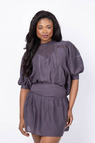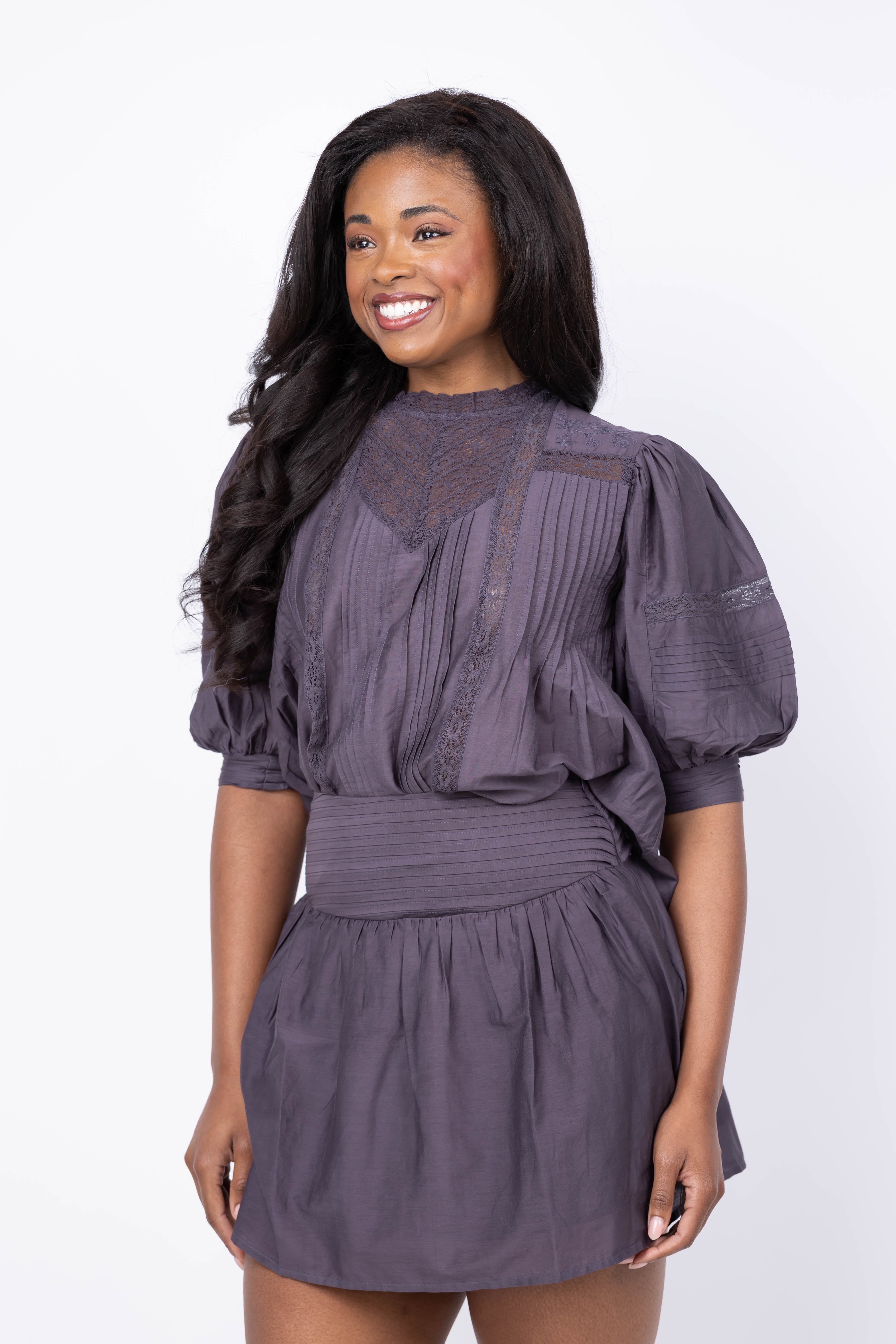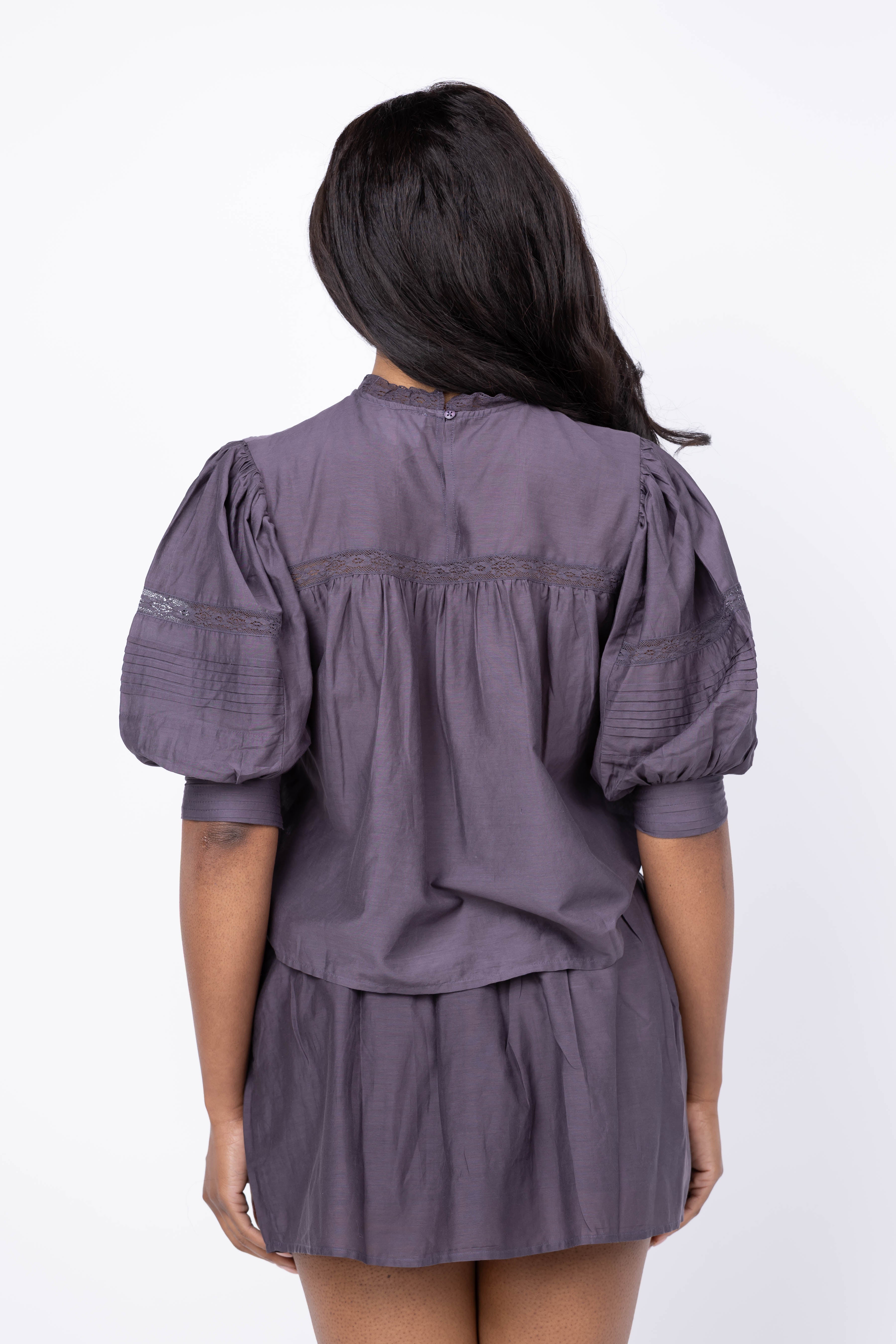 Elevate your everyday wardrobe with the Moni Top in Aubergine—a sophisticated piece that seamlessly blends comfort with refined elegance. Crafted from a luxurious cotton-silk blend, this top feels as beautiful as it looks. Delicate lace detailing and feminine pin tucks add visual interest, while gently draped balloon sleeves with cuffs create a graceful silhouette. The standout lace collar brings an unexpected touch of romance. Perfectly proportioned for tucking into high-rise bottoms, this versatile top transitions effortlessly from day to evening. Pair it with the Madeline Skirt for a complete, polished look.