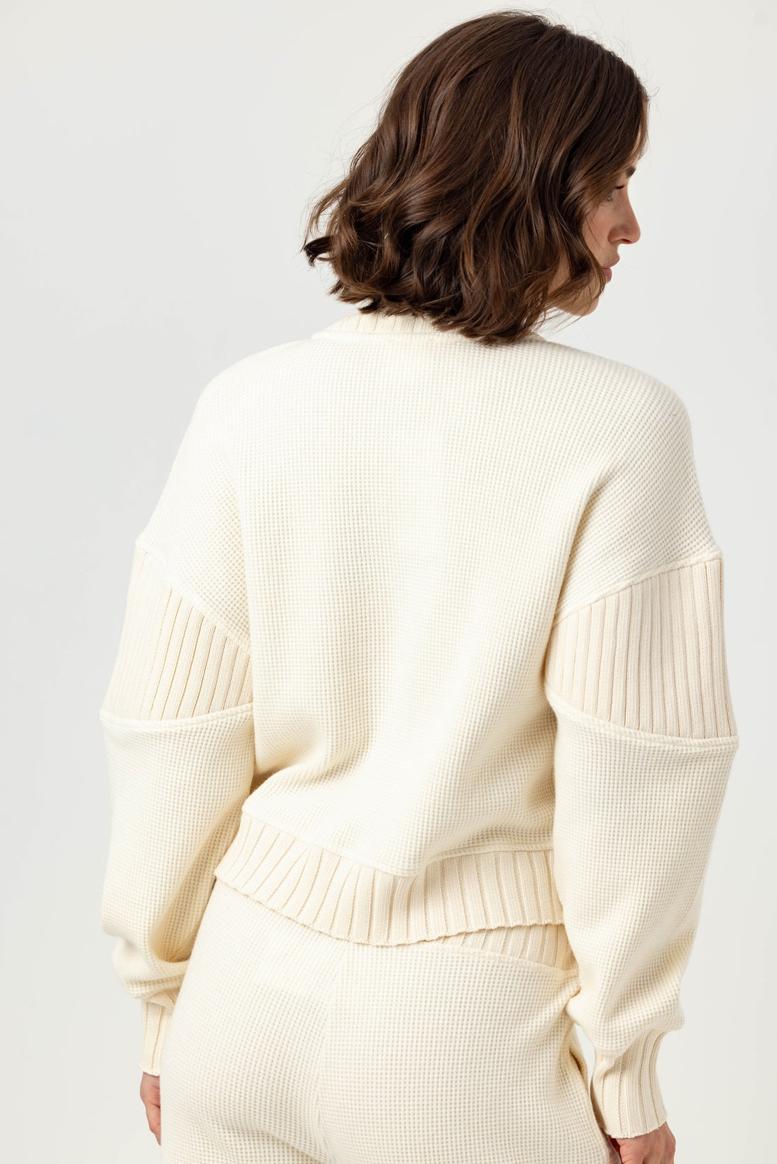 Elevate your everyday comfort with the We Are Sundays Senette Pullover in Winter White. Crafted from luxurious thermal fabric blended with soft sweater rib, this piece delivers warmth without bulk. The button-up mock neck collar adds versatile styling options, while the relaxed, oversized silhouette flatters every frame. Perfect for layering or wearing solo, it's the effortless essential your wardrobe needs. Complete the look by pairing it with the matching Piper Jogger for a coordinated set that transitions seamlessly from weekend lounging to casual outing.