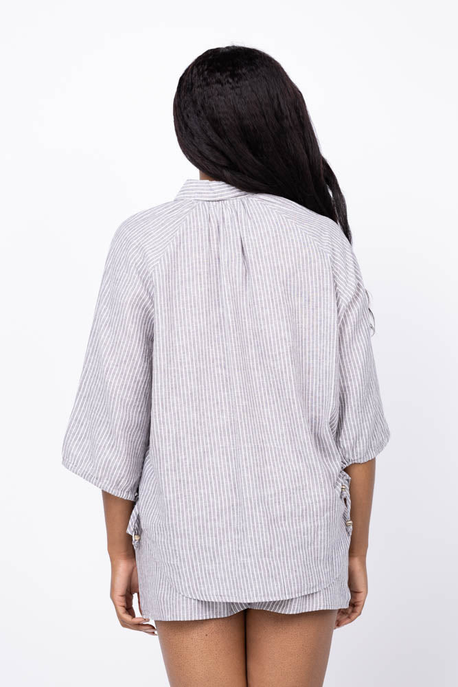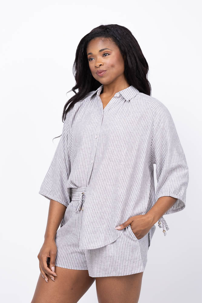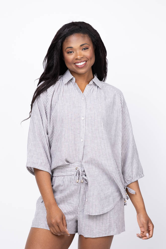 The We Are Sundays Stone Stripe Fisher Shirt is an oversized button-up crafted from breezy yarn-dye striped linen, offering a relaxed silhouette with a classic collar and adjustable tie sleeves for a soft, feminine touch. Designed for effortless layering or as a summer staple, its perfect length makes it ideal for a classic French tuck. Pair it with the matching Penny Shorts for a polished warm-weather look. For a slimmer fit, sizing down is recommended. Embrace comfort and style with this versatile, timeless piece.