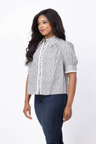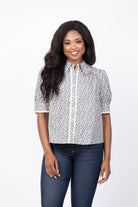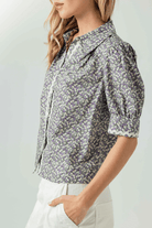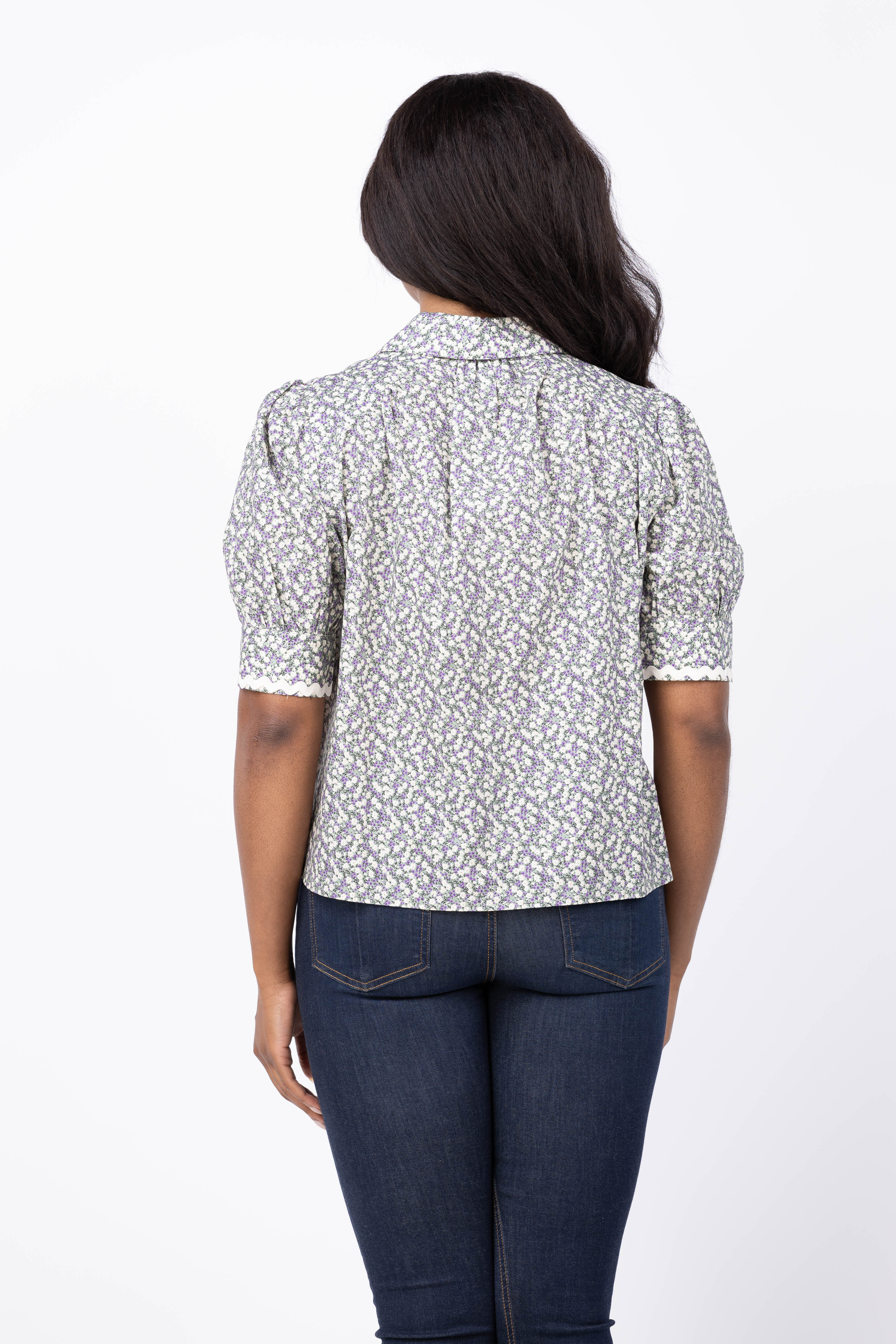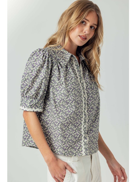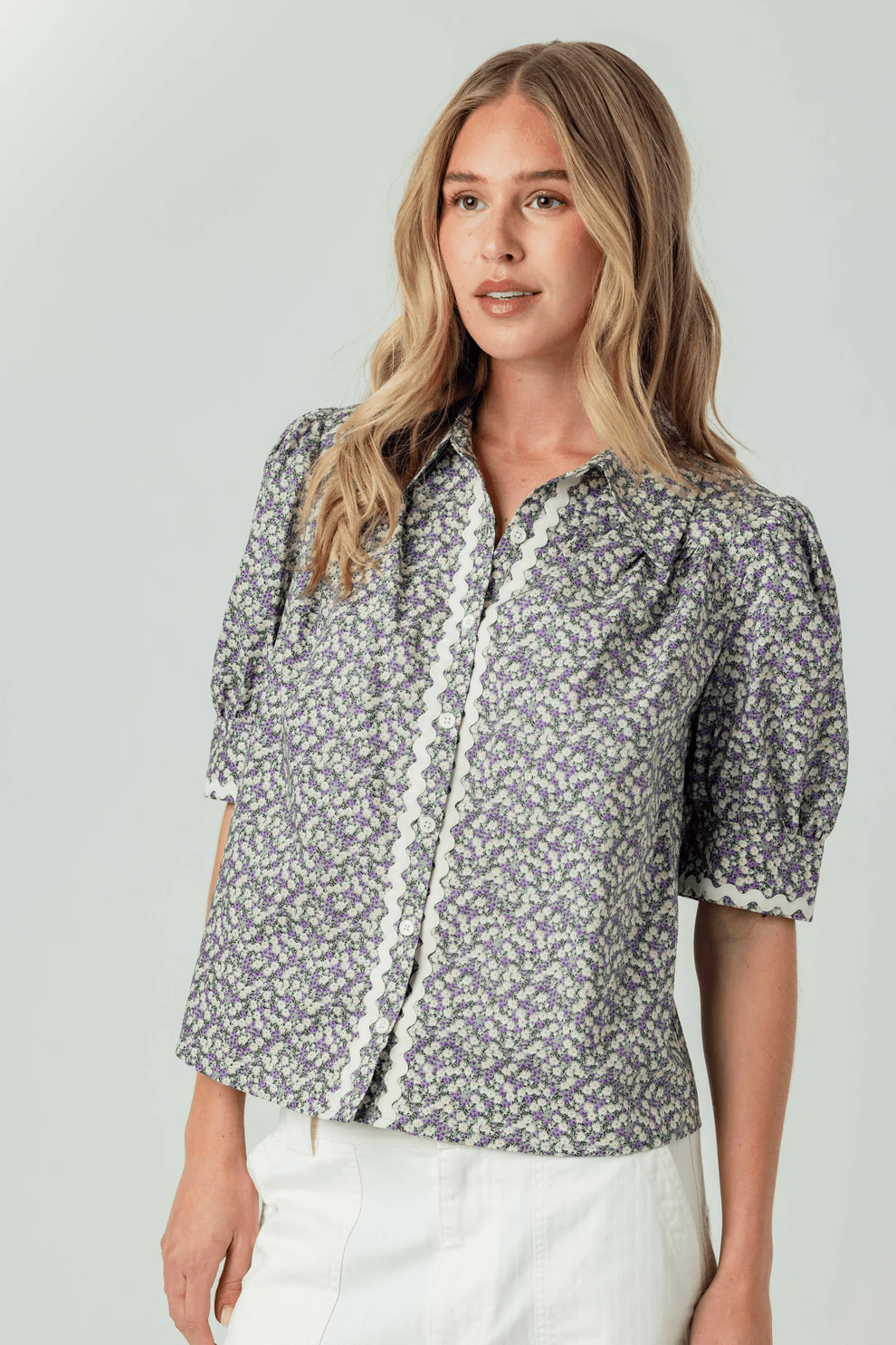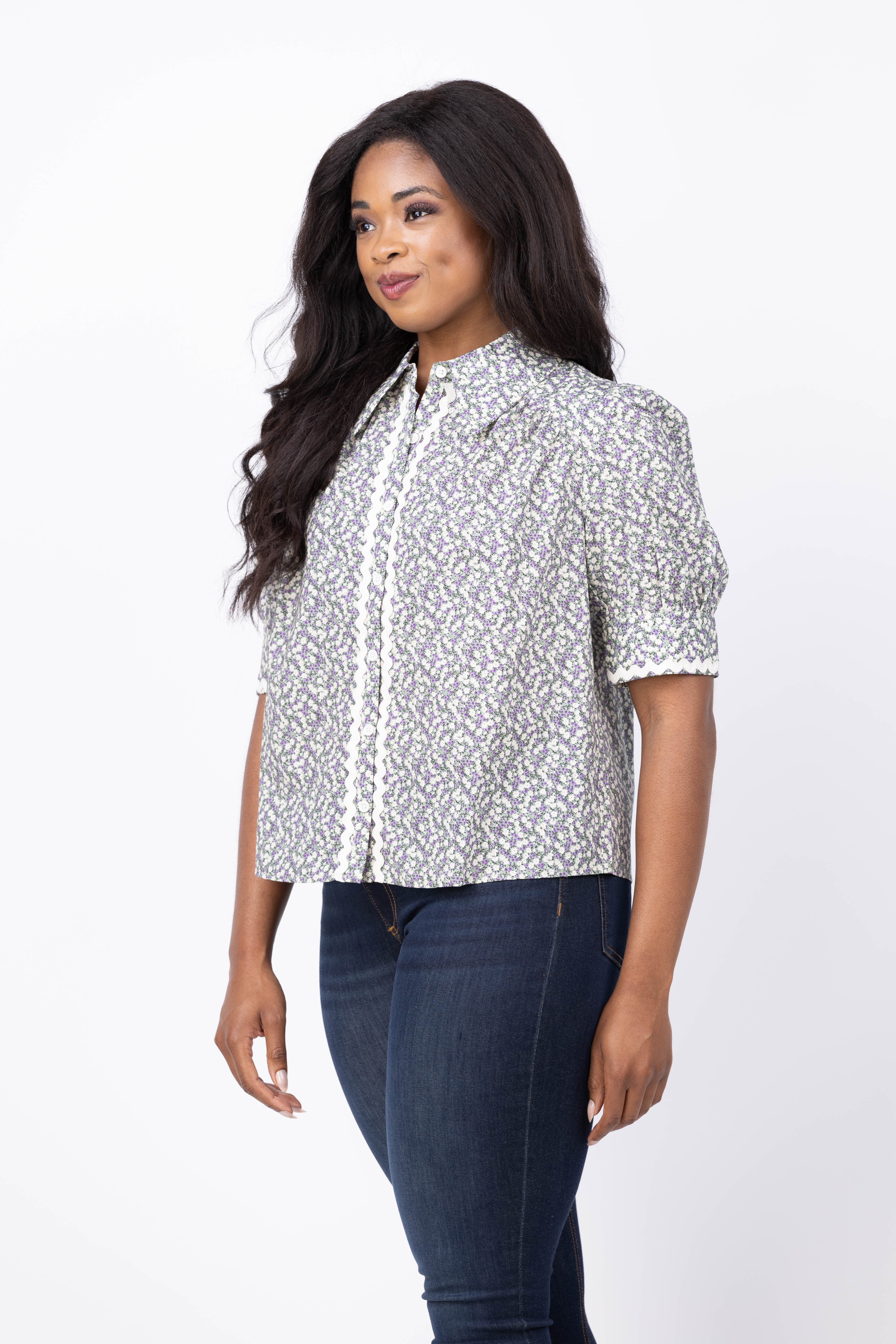 The We Are Sundays Zinnia Print Klariza Shirt in Zinnia Lavender Bloom combines timeless style with fresh, floral charm. Featuring a relaxed fit with slight puff sleeves, button cuffs, and a delicate rounded collar, this short-sleeve button-front shirt offers versatile wear—perfect untucked or tucked to highlight your waist. The standout Zinnia Bloom print is beautifully accented by Rik Rak detailing along the center front and sleeves, adding a unique touch to a fan favorite. Designed to finish at the natural waist, Klariza pairs effortlessly with casual or polished looks. Consider sizing down for a more tailored fit.
