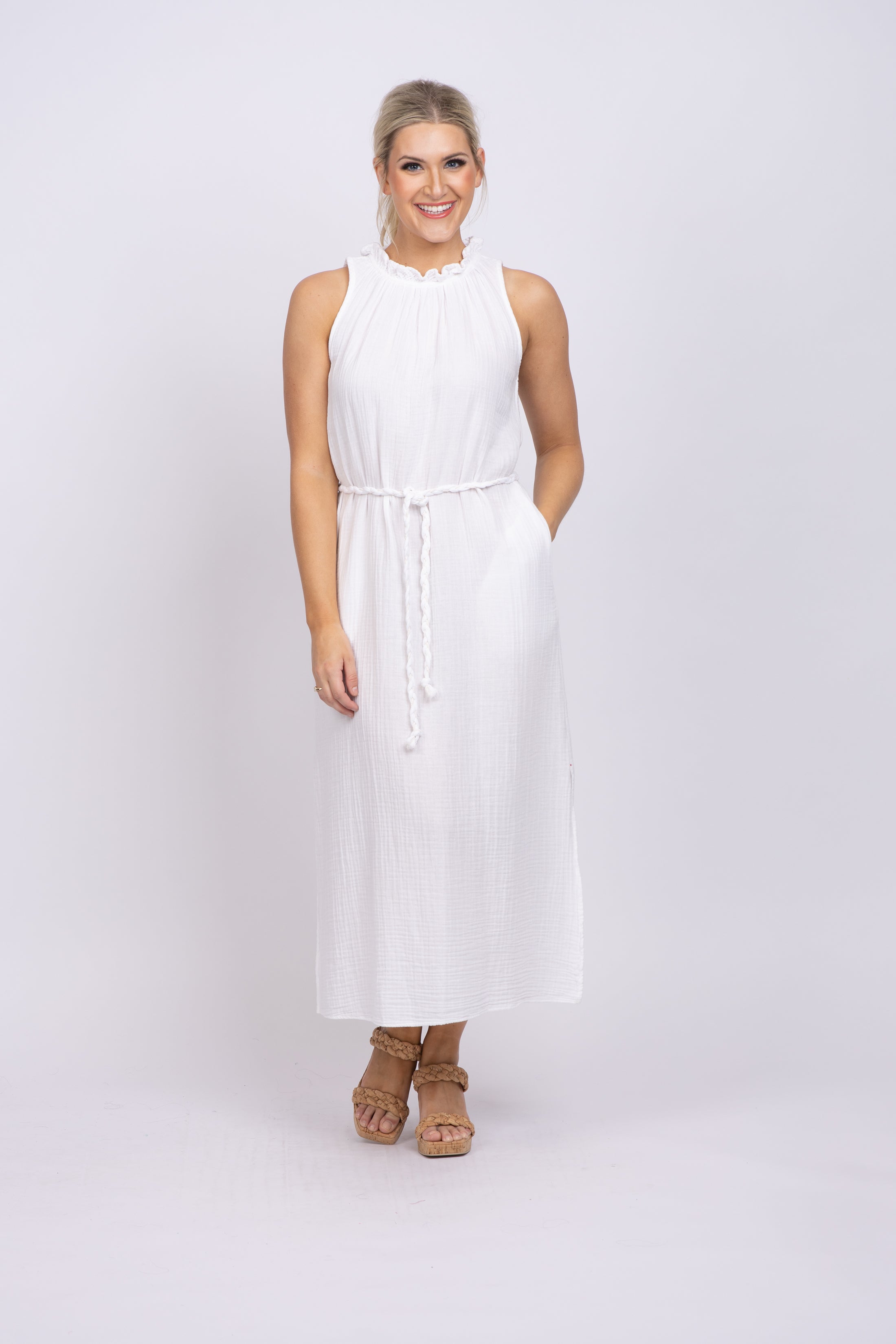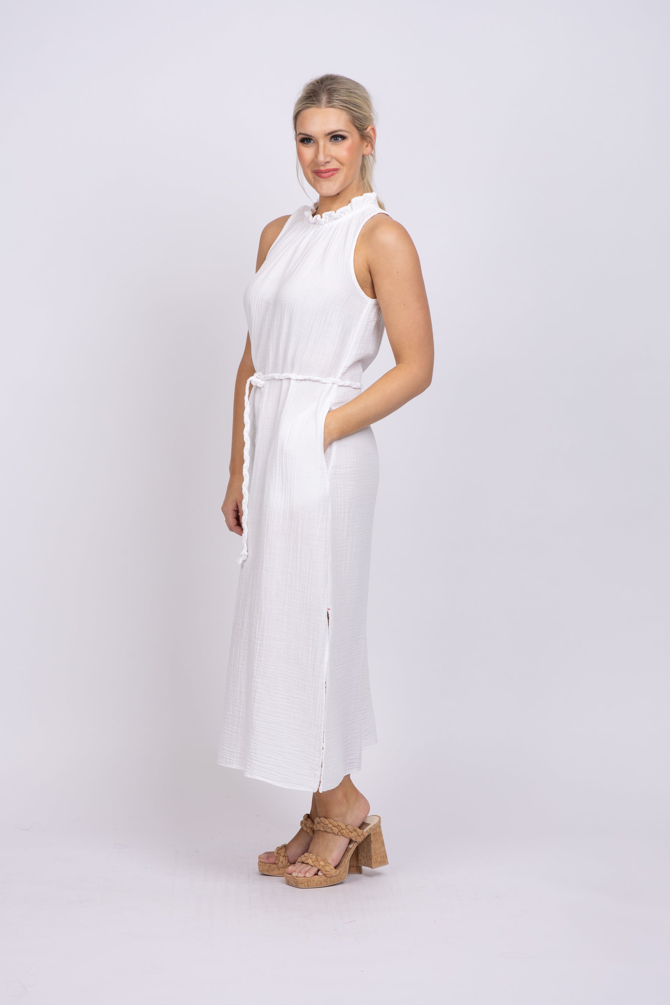 The Xirena Etta Dress in White is designed to impress. Crafted from our washed double-faced cotton gauze, it offers a soft and gently crinkled feel. With a ruffle neck and keyhole back, this midi dress also has side seam pockets, hem side slits, and an optional rope belt for added comfort and style. Deceptively simple, the Etta Dress is an elegant essential.