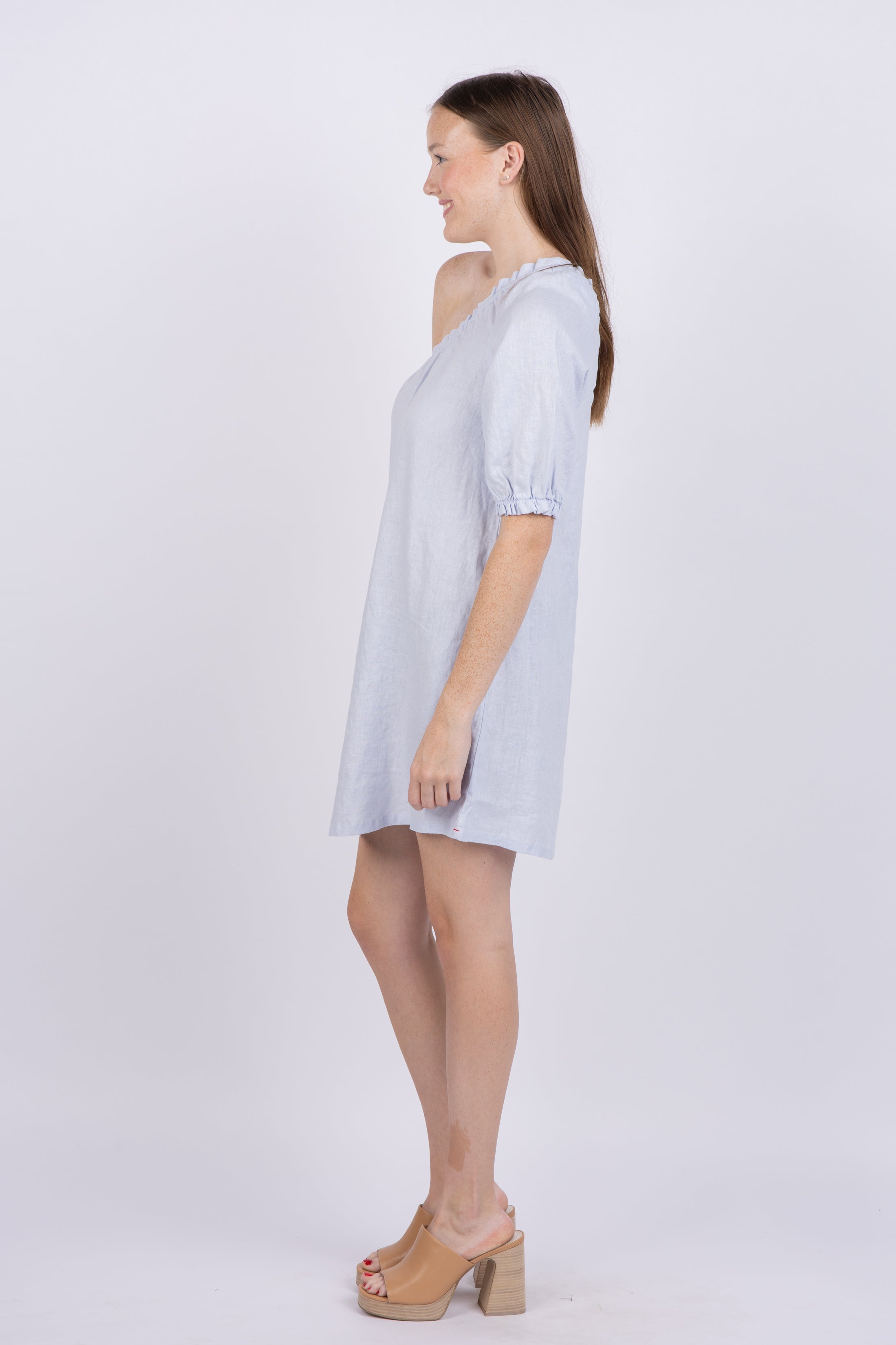 Made with lightweight linen, Pippa is a one-shoulder mini dress with a blouson sleeve, ruffle trim, elastic at the neck and sleeve, and side seam pockets. Pair this dress with natural wedges for an effortless summer look, or slide on a pair of sandals for a casual daytime fit!