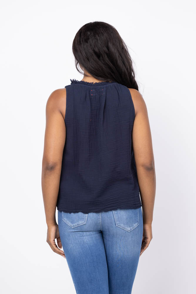 The XiRENA Rosie Top in North Star offers effortless style with its soft, washed double-faced cotton gauze fabric that feels light and breathable. Designed with a raw edge scoop neck, a delicate keyhole button-front, and flattering shirring throughout, this sleeveless top combines comfort and charm for your warm-weather wardrobe. Perfect for easy, breezy days, it adds a touch of relaxed sophistication to any outfit.
