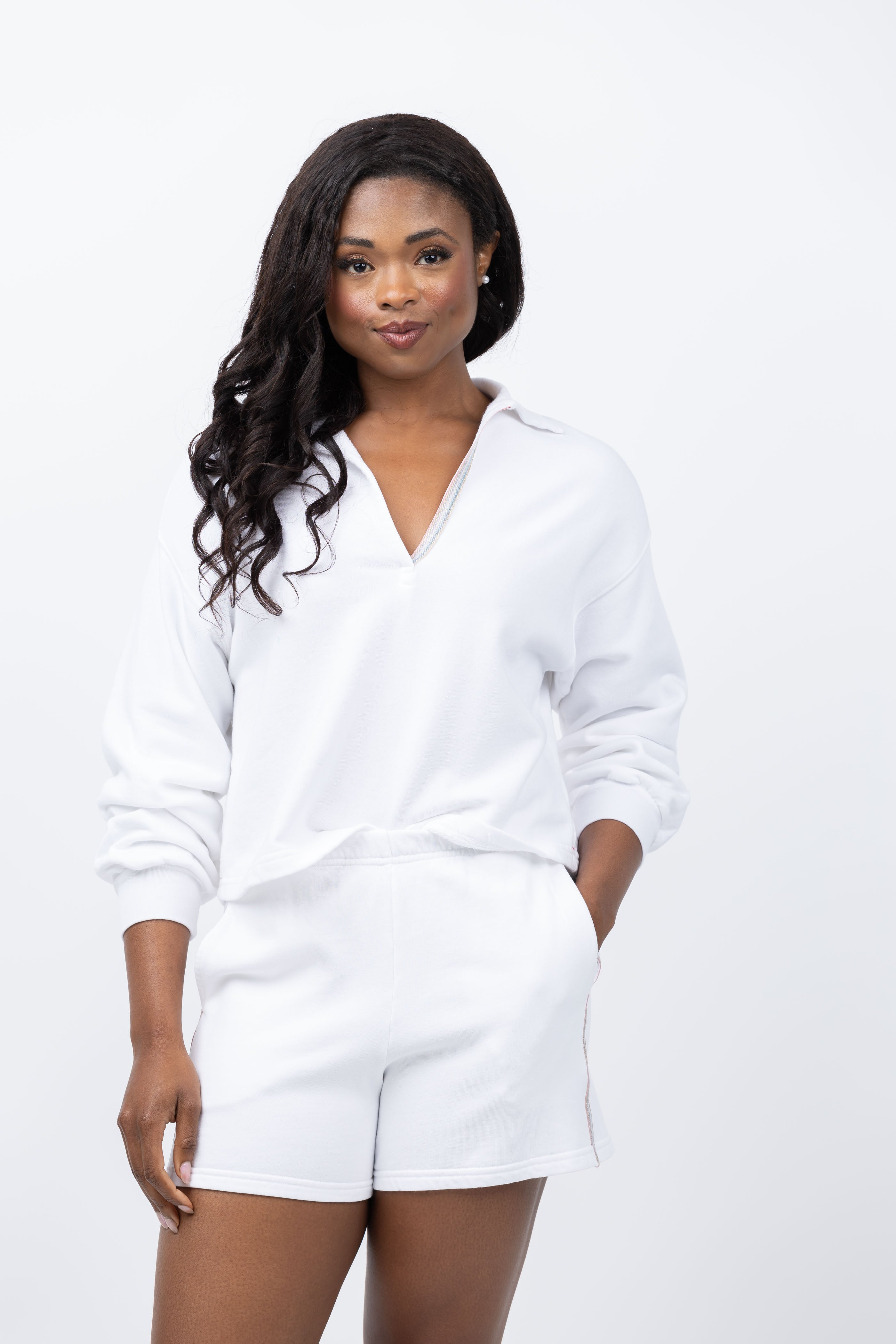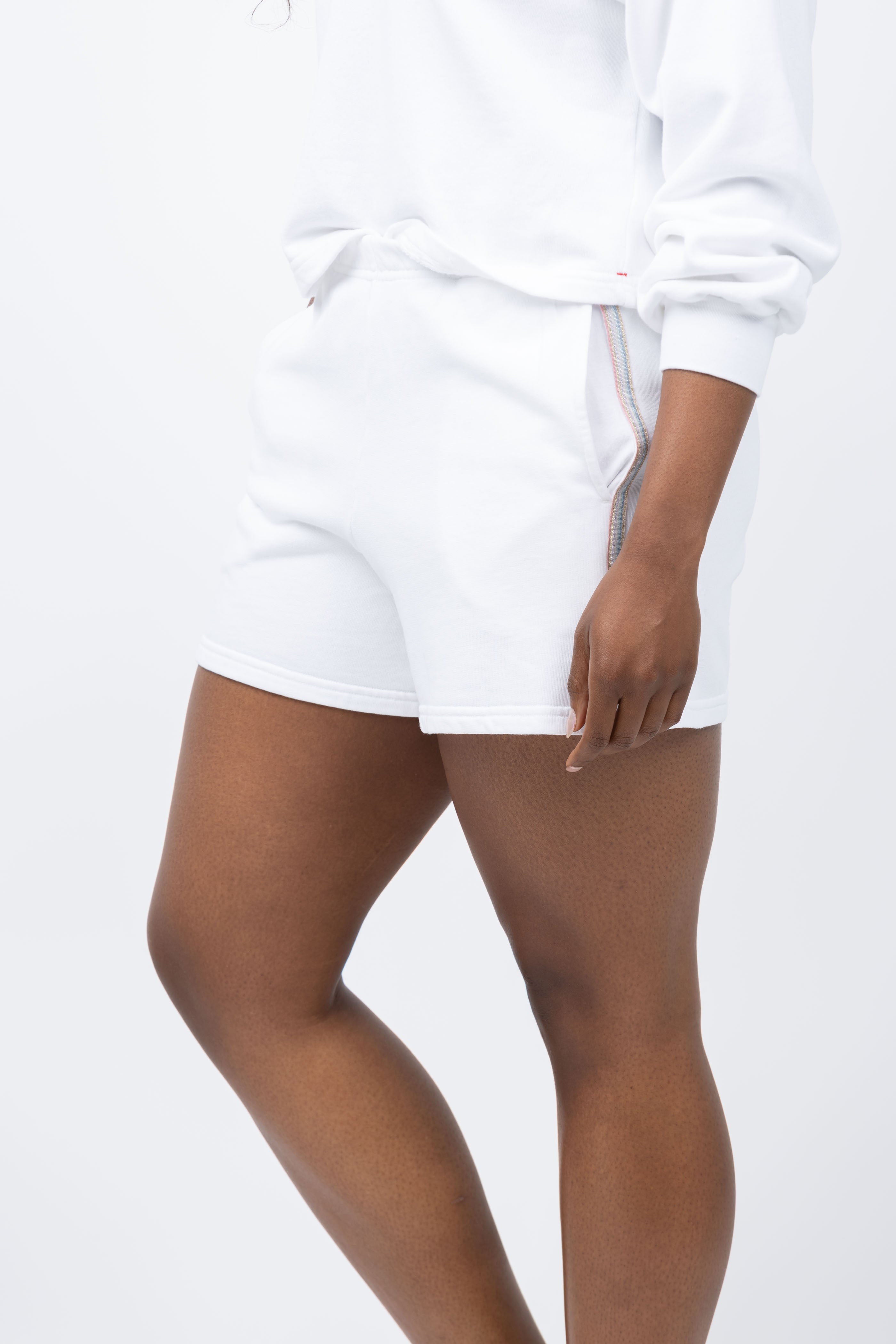 Experience ultimate comfort and style with the XiRENA Shayla Sweatshort in White Prism. These 4" sweatshorts feature a dazzling glitter stripe detail on the sides, adding a touch of sparkle to your look. Perfectly paired with the Holman Sweatshirt, these shorts are the ideal blend of comfort and fashion. Get ready to lounge in style!