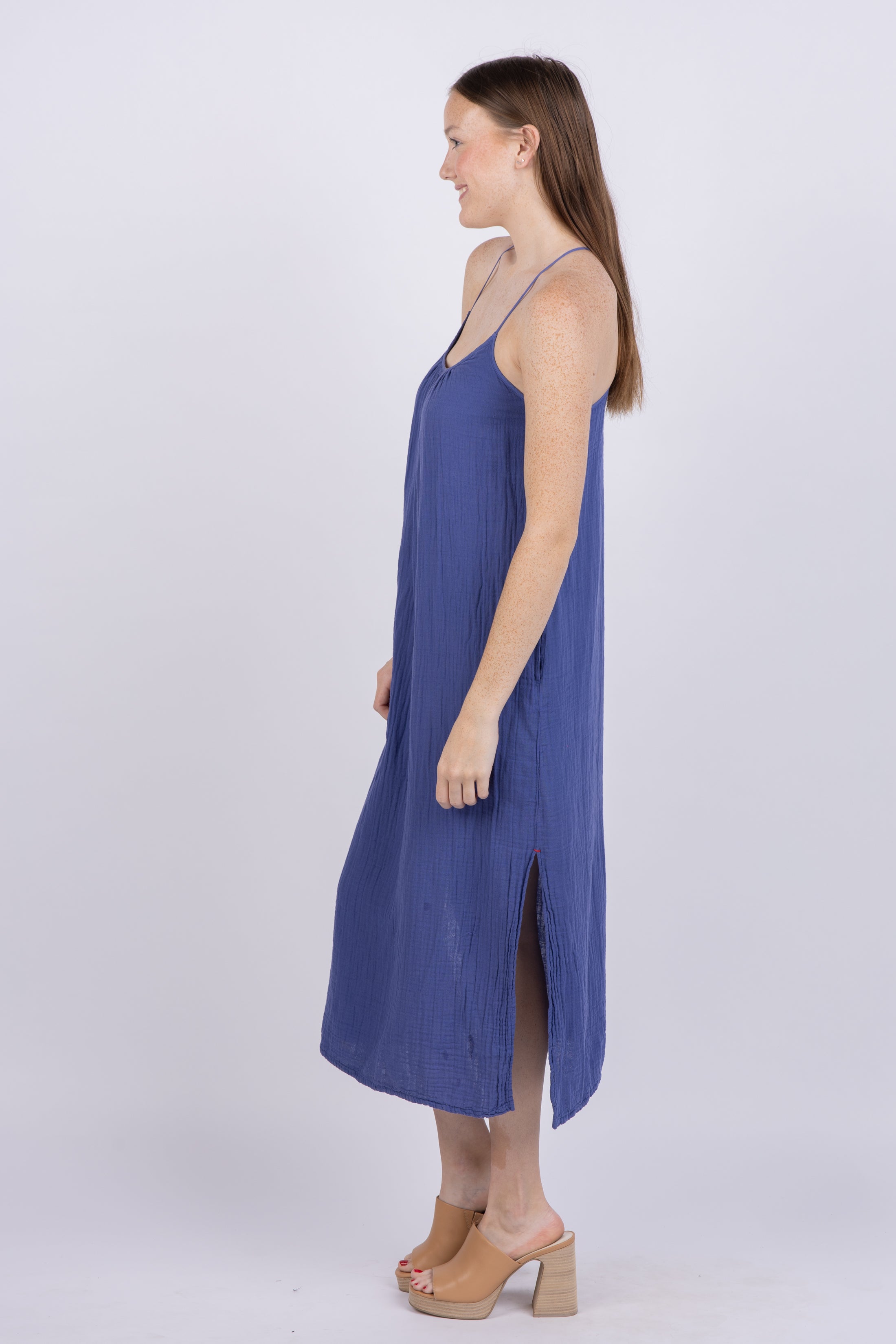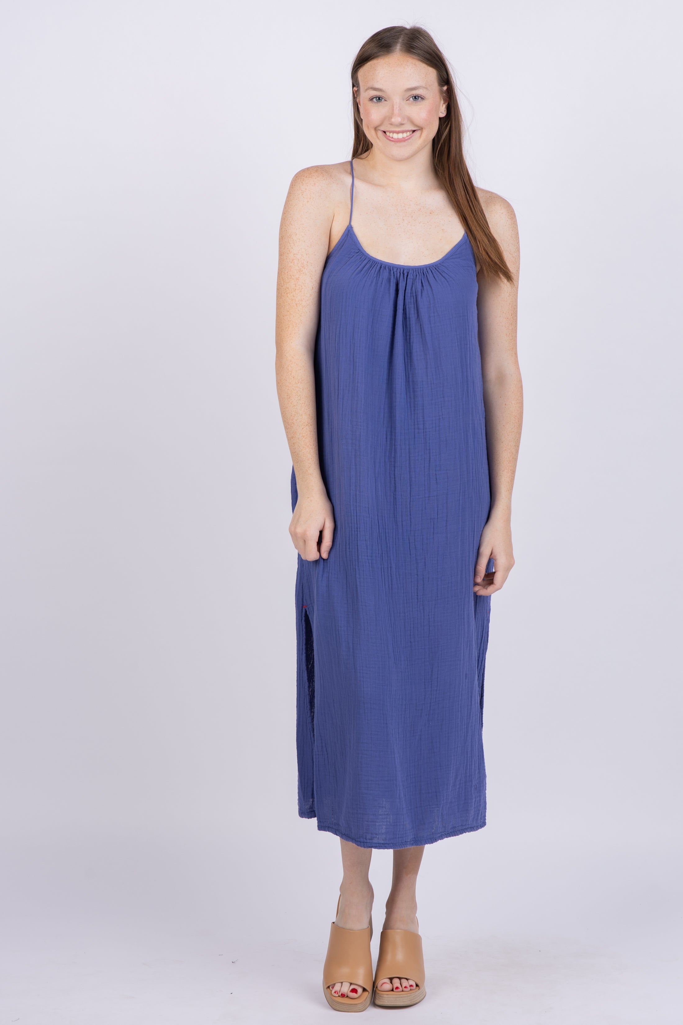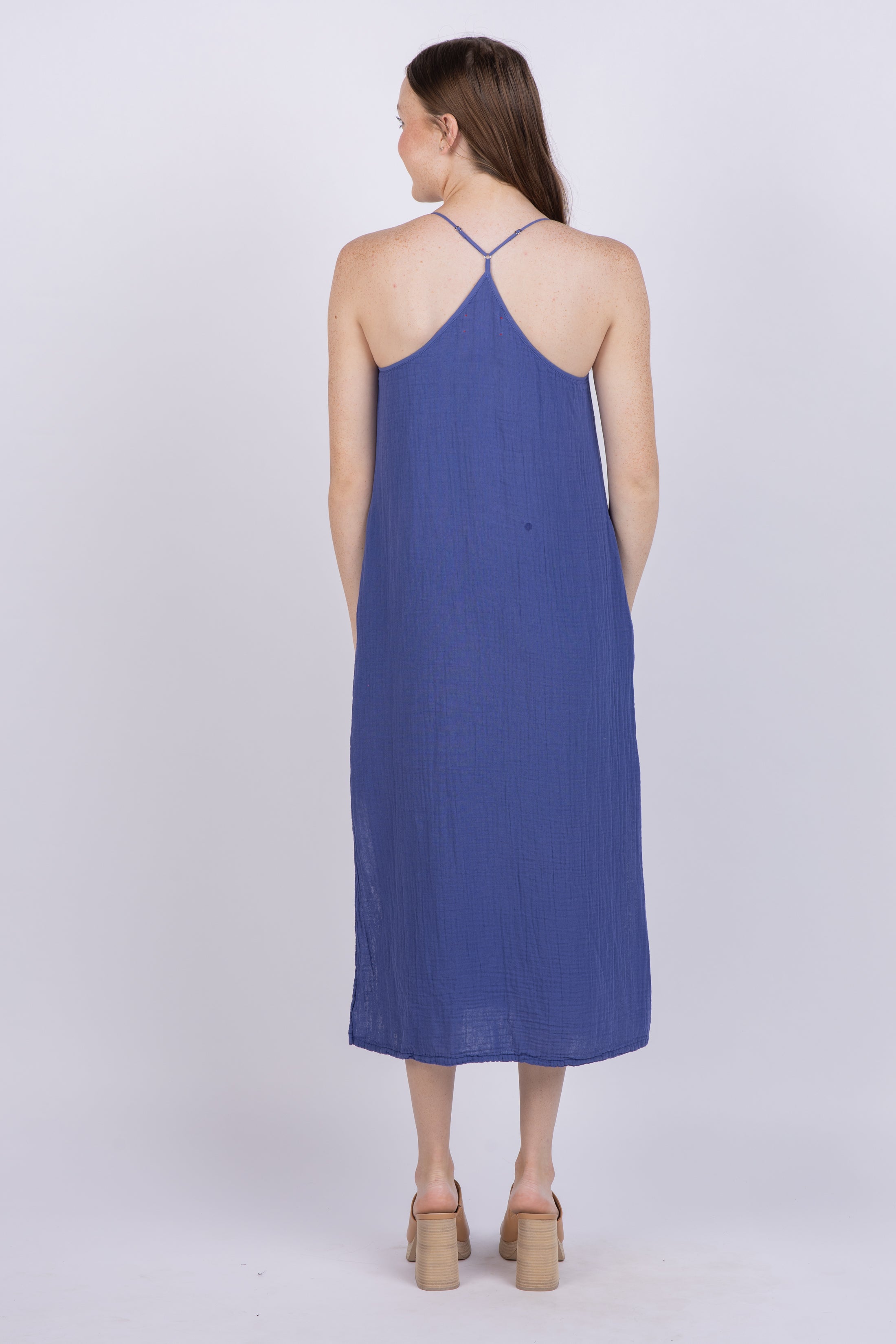 Talia is luxuriously crafted from washed double-faced cotton gauze, lending her a soft, luxurious texture. This sun-kissed sundress features a scoop neckline, a T-back strap, and side pockets for an effortlessly chic silhouette.